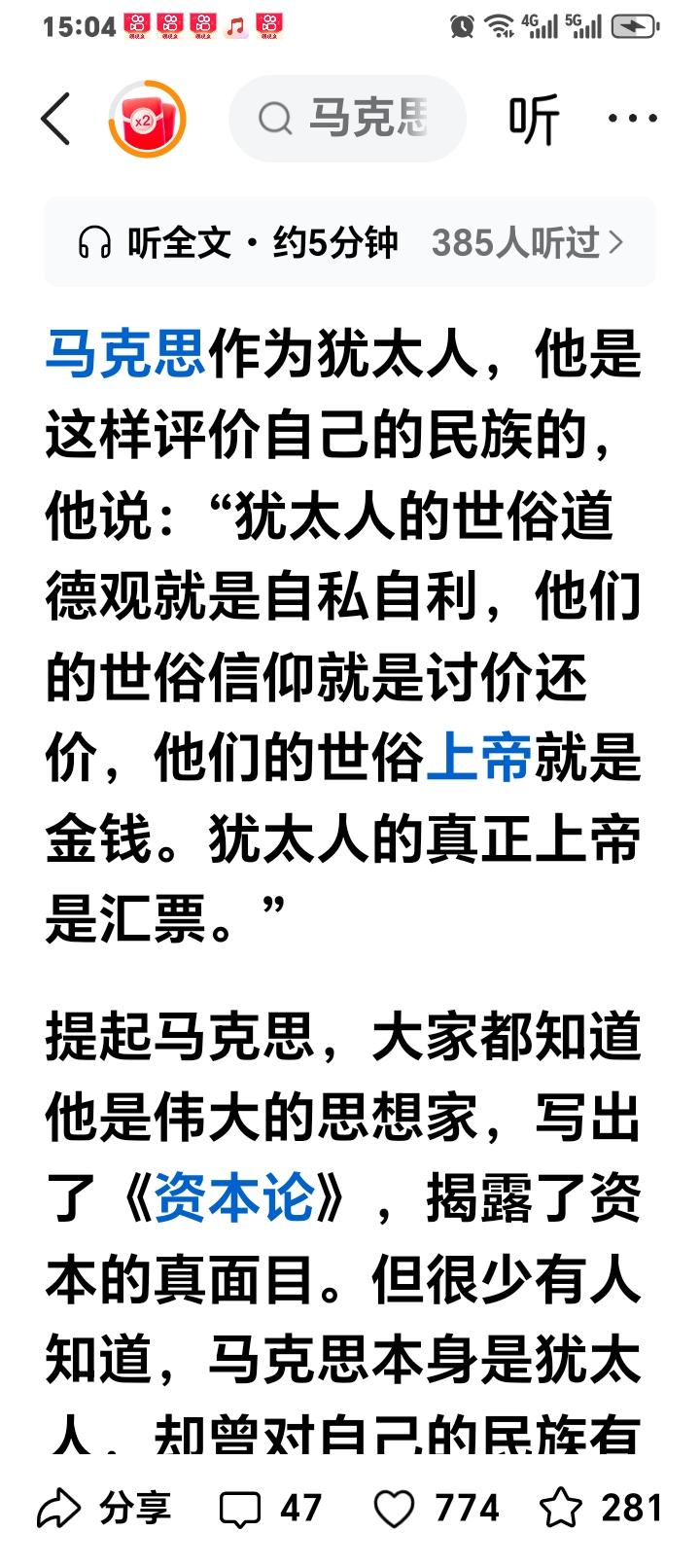 马克思是德国人,去世于英国。马克思的“资本论”都知道。 马克思是犹太人。马克思说过,犹太人的世俗道德观就是自私自利,他们的世俗信仰就是讨价还价,他们的世俗上帝就是金钱,犹太人的真正上帝就是汇票。 现在的美国就是被犹太人控制,犹太人给世界带来了太多灾难。但也不得不佩服犹太人精明和控制能力! 谁都不知道犹太人还能祸害世界多久?但愿美国信仰的上帝能睁开眼睛!