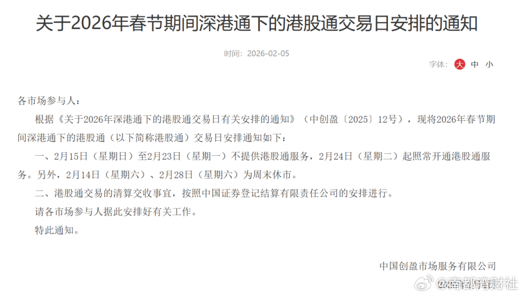 2026年春节期间深港通下的港股通(以下简称港股通)交易日安排通知如下:2月15日(星期日)至2月23日(星期一)不提供港股通服务,2月24日(星期二)起照常开通港股通服务。另外,2月14日(星期六)、2月28日(星期六)为周末休市。