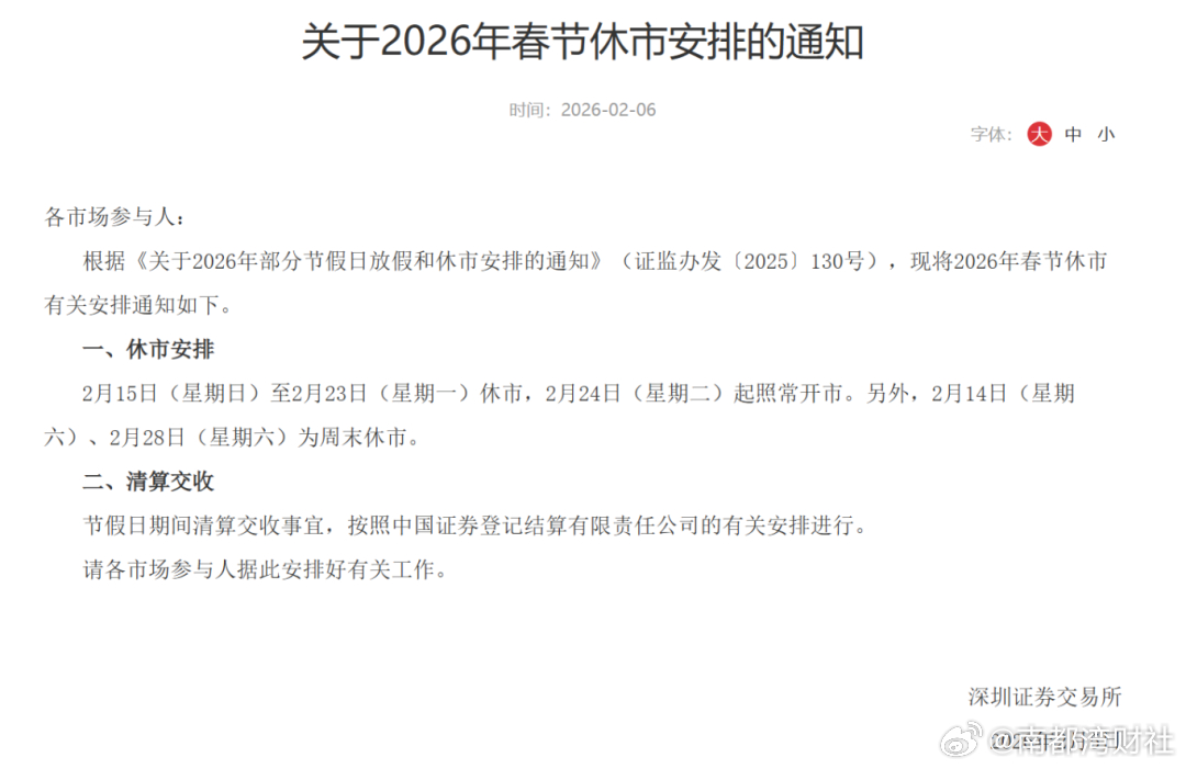 深圳证券交易所2026年春节休市有关安排通知如下:2月15日(星期日)至2月23日(星期一)休市,2月24日(星期二)起照常开市。另外,2月14日(星期六)、2月28日(星期六)为周末休市。