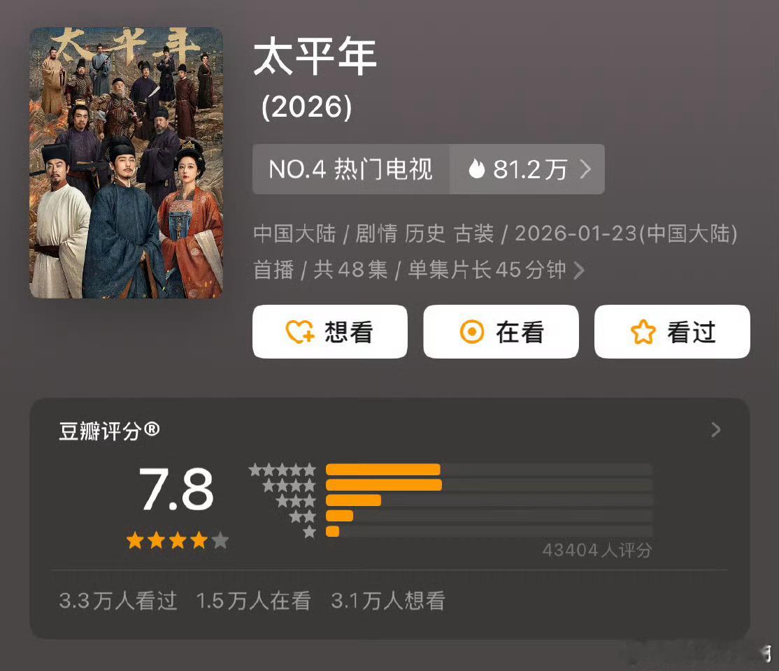 白宇周雨彤新剧豆瓣开分7.8周雨彤太平年豆瓣开分7.8 白宇周雨彤的《太平年》豆瓣开分 7.8 赵丽颖《小城大事》开分才7.1网上都是批判太平年的 结果分数还高