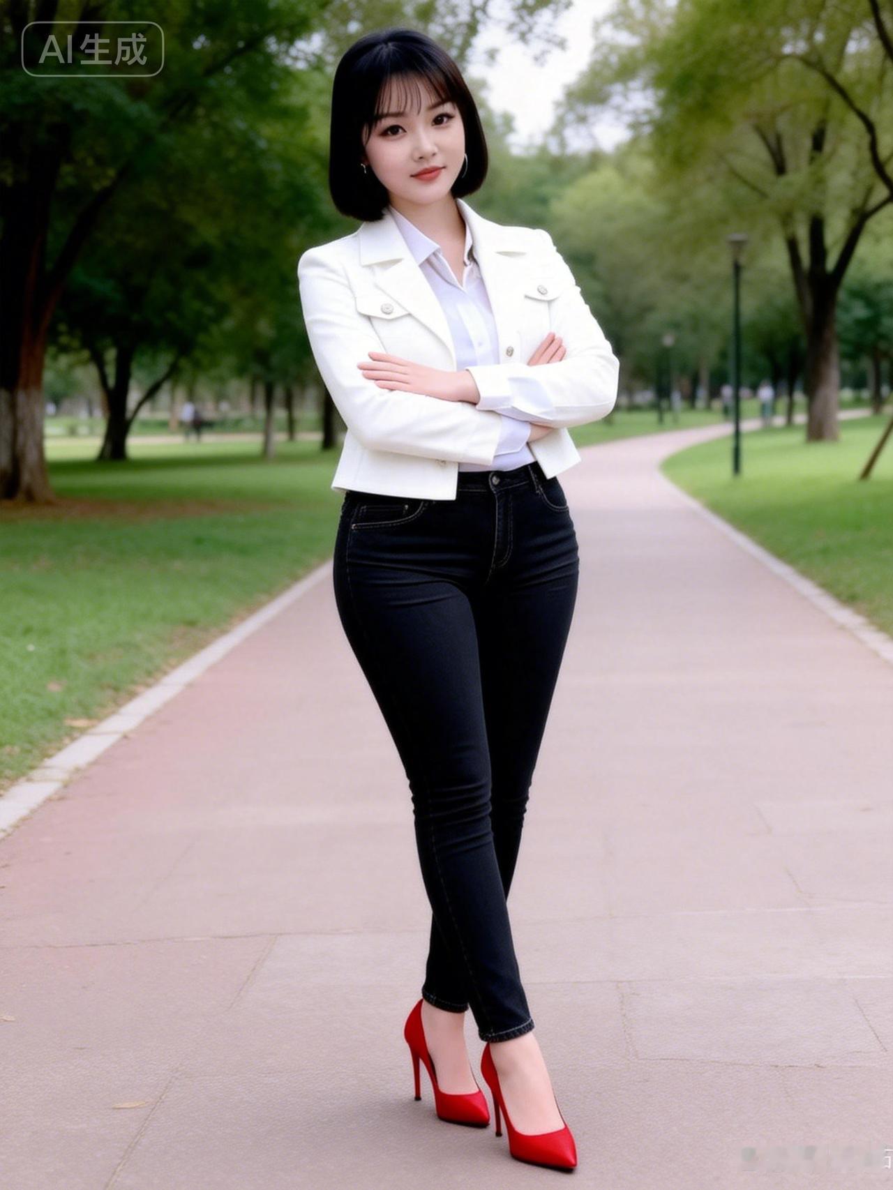 白色西装外套+黑色牛仔裤+红色高跟鞋,都市女郎的完美搭配!