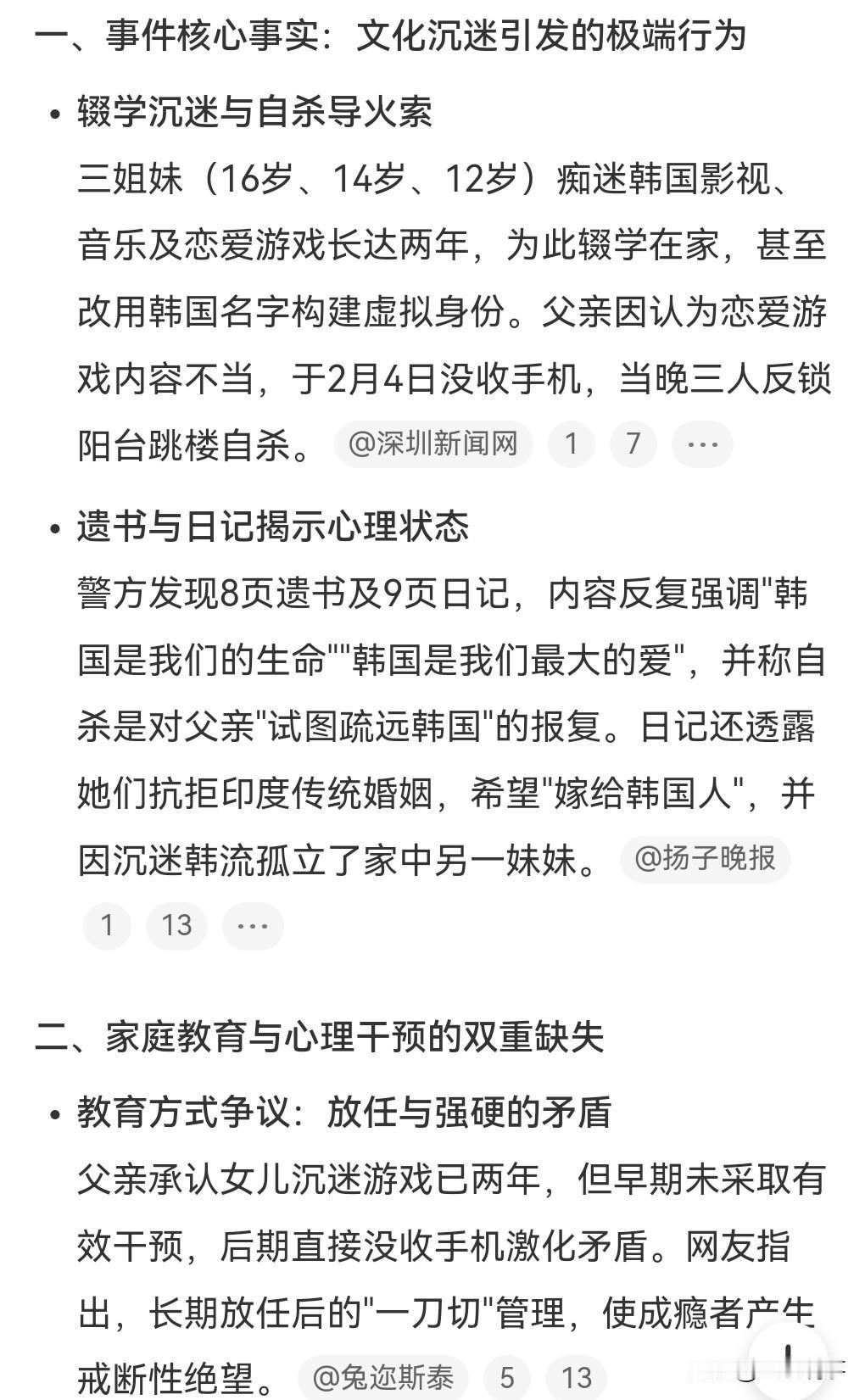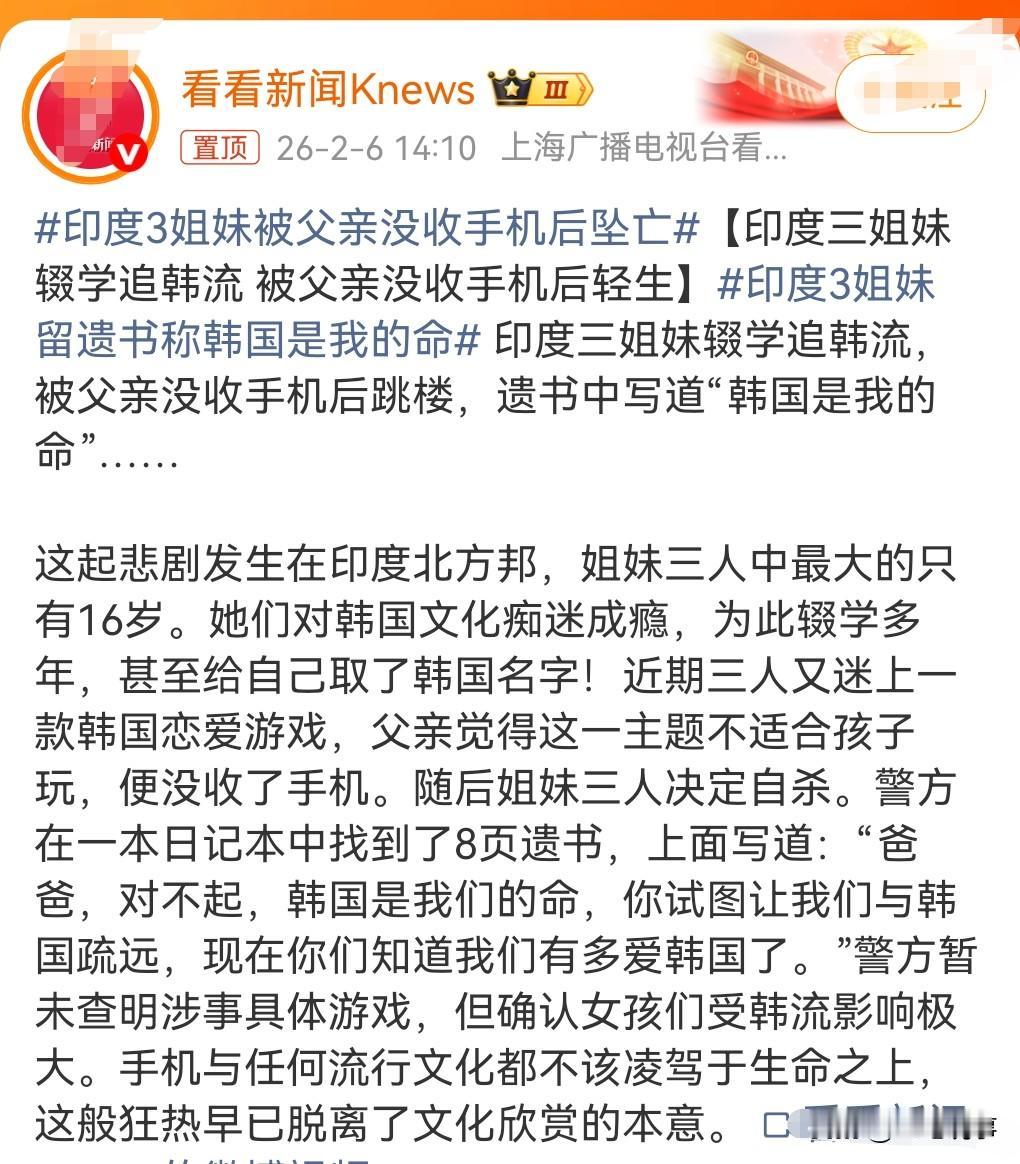 这也太离谱了吧,年纪轻轻竟然选择轻生。 韩流的魅力这么大的吗?也太凶猛了吧。 2月4日,辍学在家,痴迷韩流的印度三姐妹,由于被父亲没收了手机。 三人选择了轻生,并留下八页遗书称韩国是我的命。 令人匪夷所思的是,追韩流追到辍学,这也太沉迷了吧。 父亲发现女儿在玩韩国的一款恋爱游戏,他觉得不合适,便没收了手机,没想到发生这样的悲剧。 三个小姐妹竟然这么不珍惜生命,这么不怕死,这真是超出了我的认知。