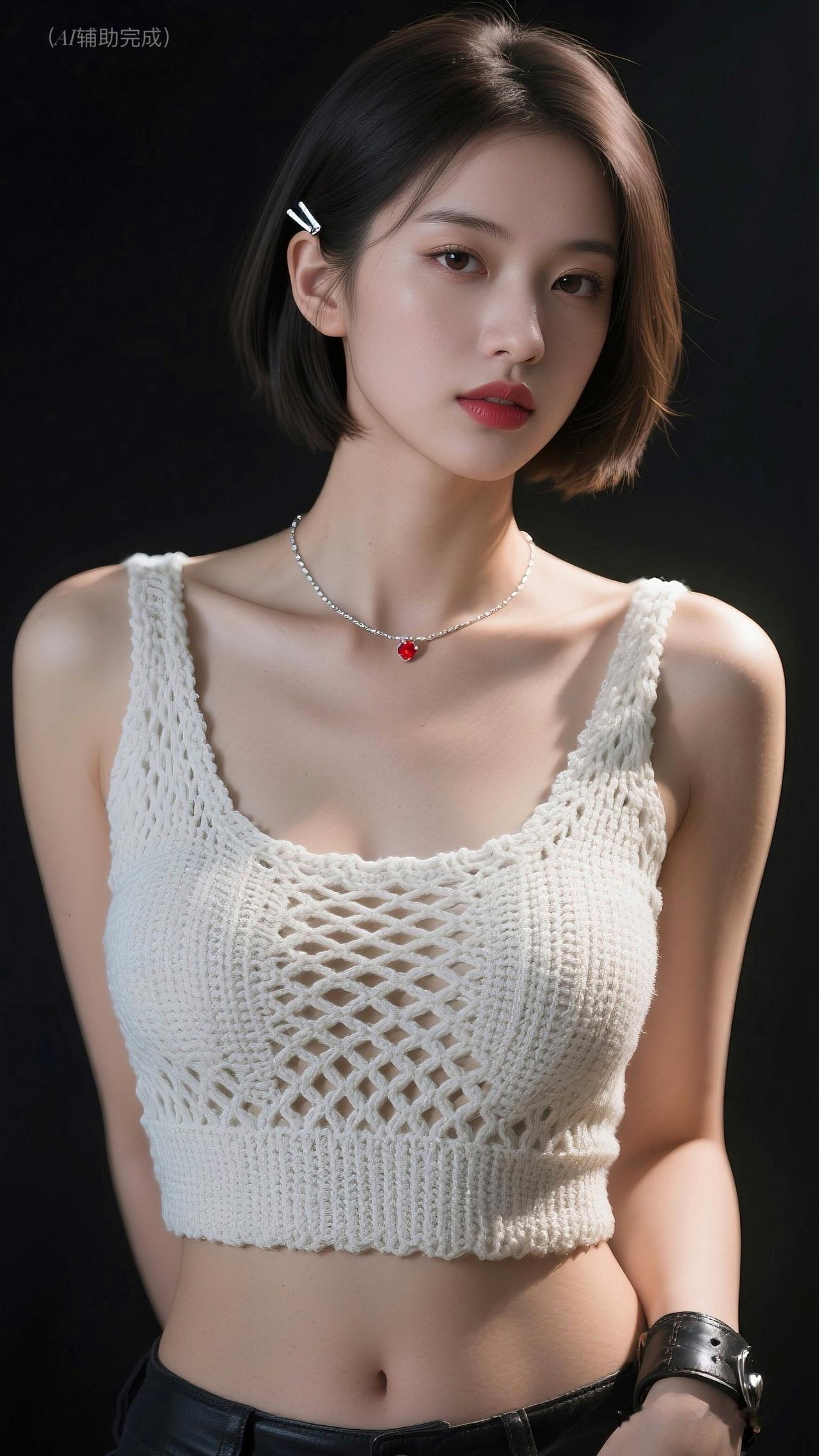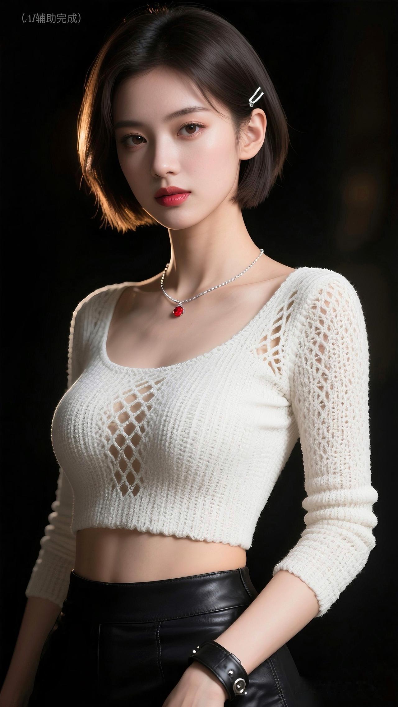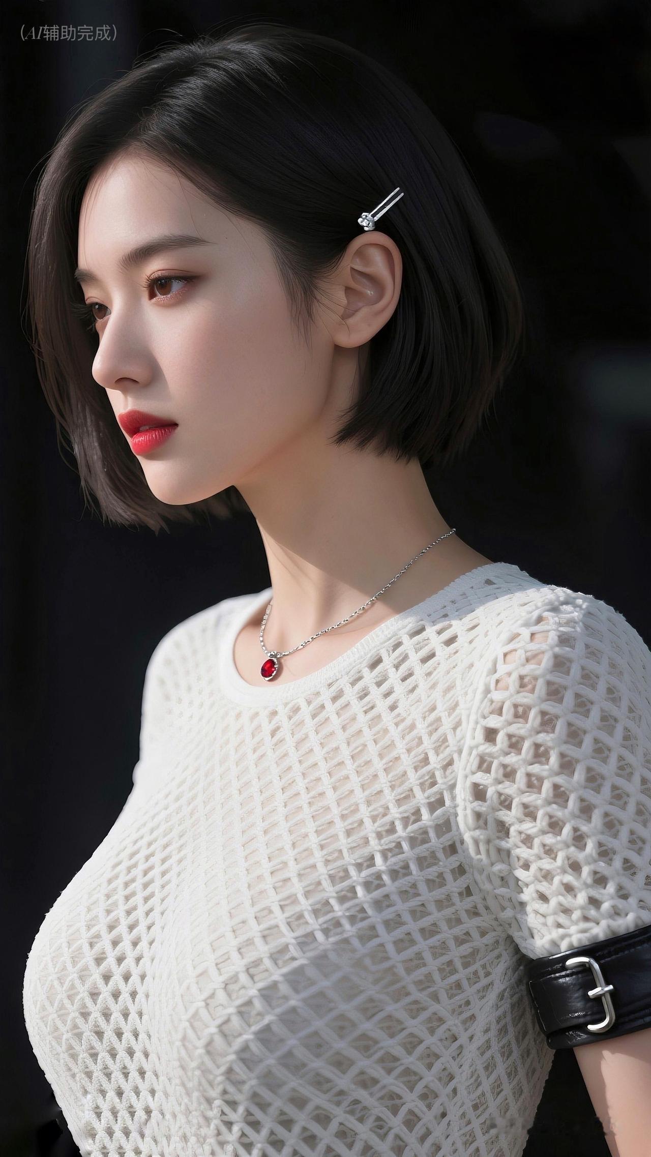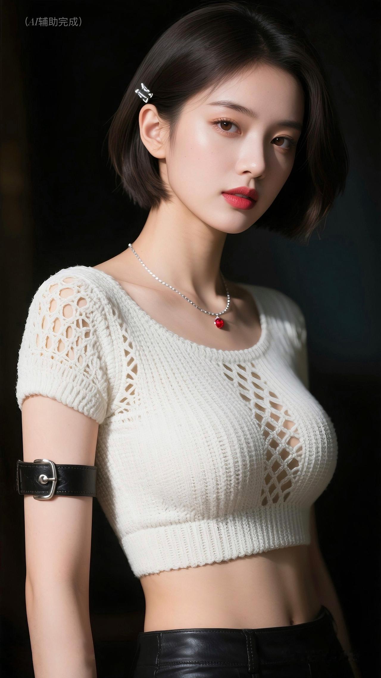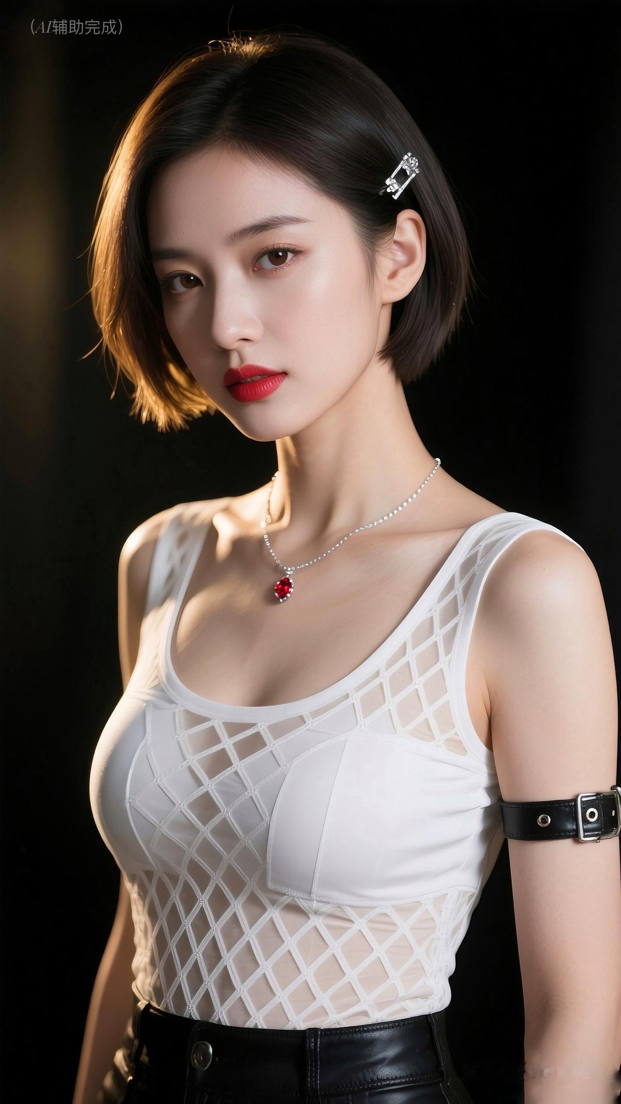 利落棕/黑短发别银白简约发卡,白镂空针织背心搭黑皮裤/皮质臂环,银链红坠点睛。纯黑背景衬冷艳,眉眼亮红唇艳,时尚个性又优雅,这帧美人一眼沦陷!