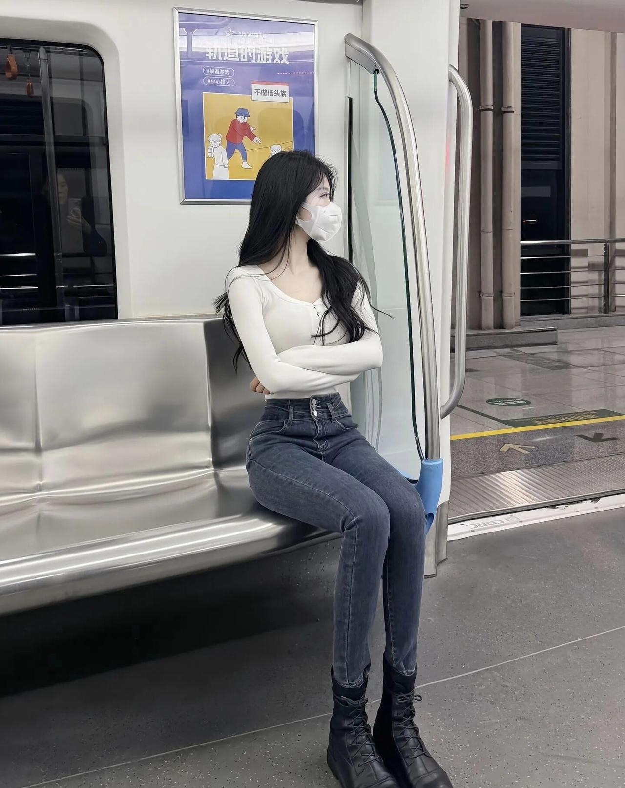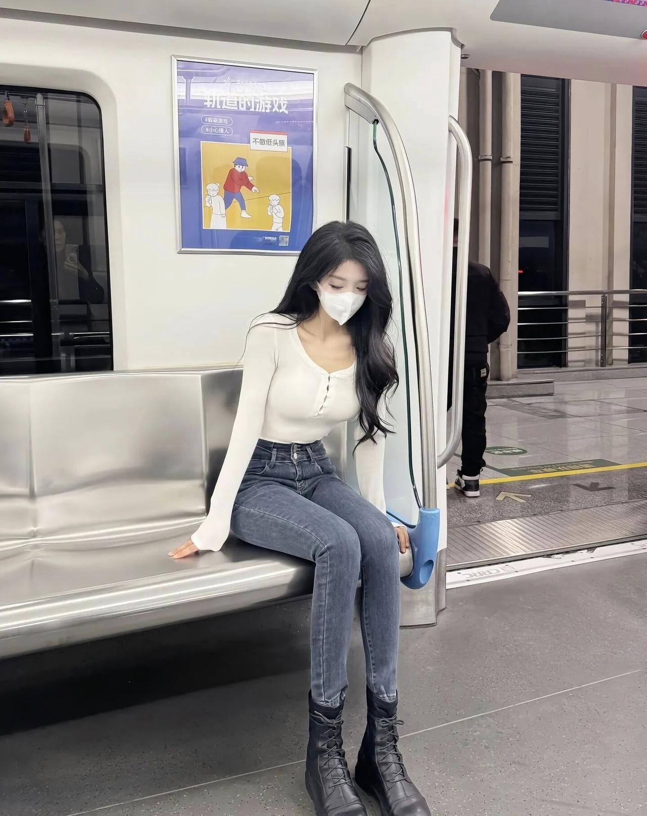 地铁上的时尚女孩,白衣牛仔裤,黑色靴子,戴着口罩,青春活力!