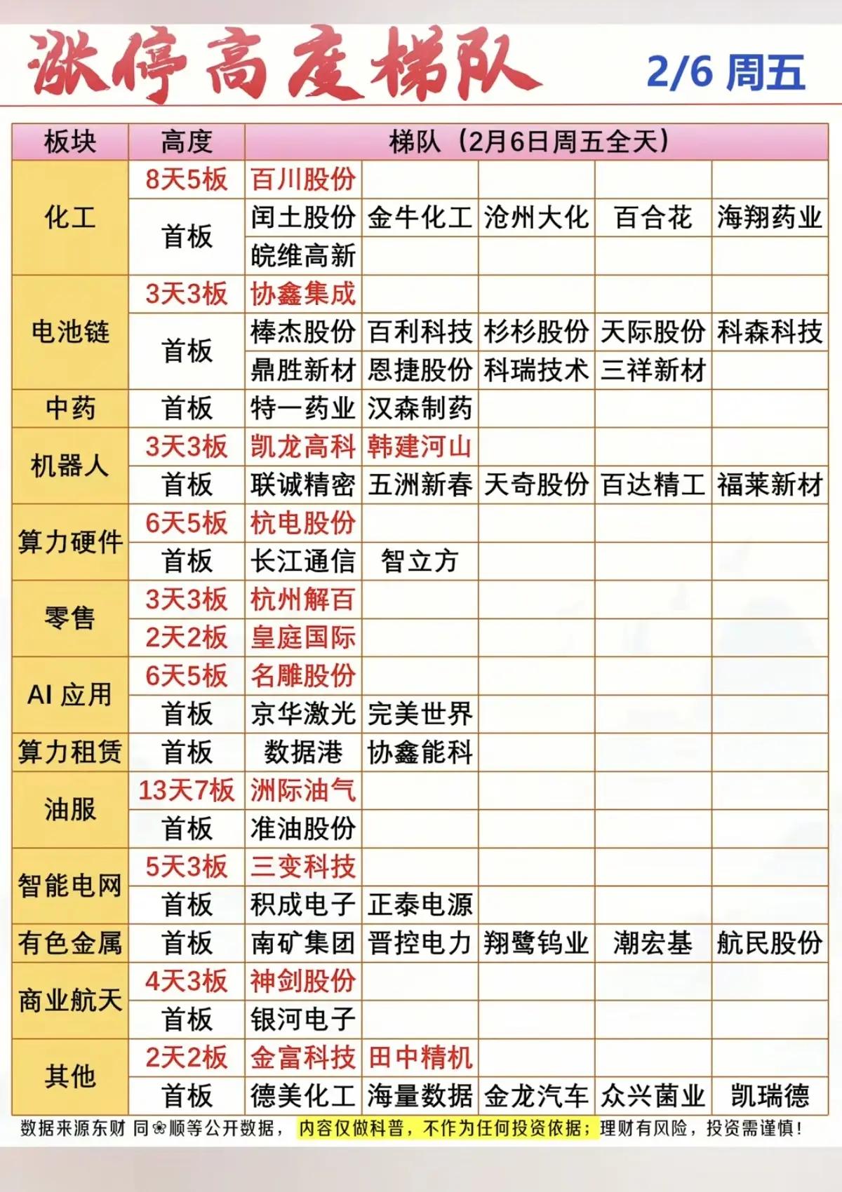 2月6日,周五A股涨停梯队一览表!!! 化工板块今日领涨,百川股份8天5板;电池板块,协鑫集成今日成功晋级3连板,后市值得重点关注;机器人板块,凯龙高科、韩建山河均成功晋级3连板,后市值得期待!!!
