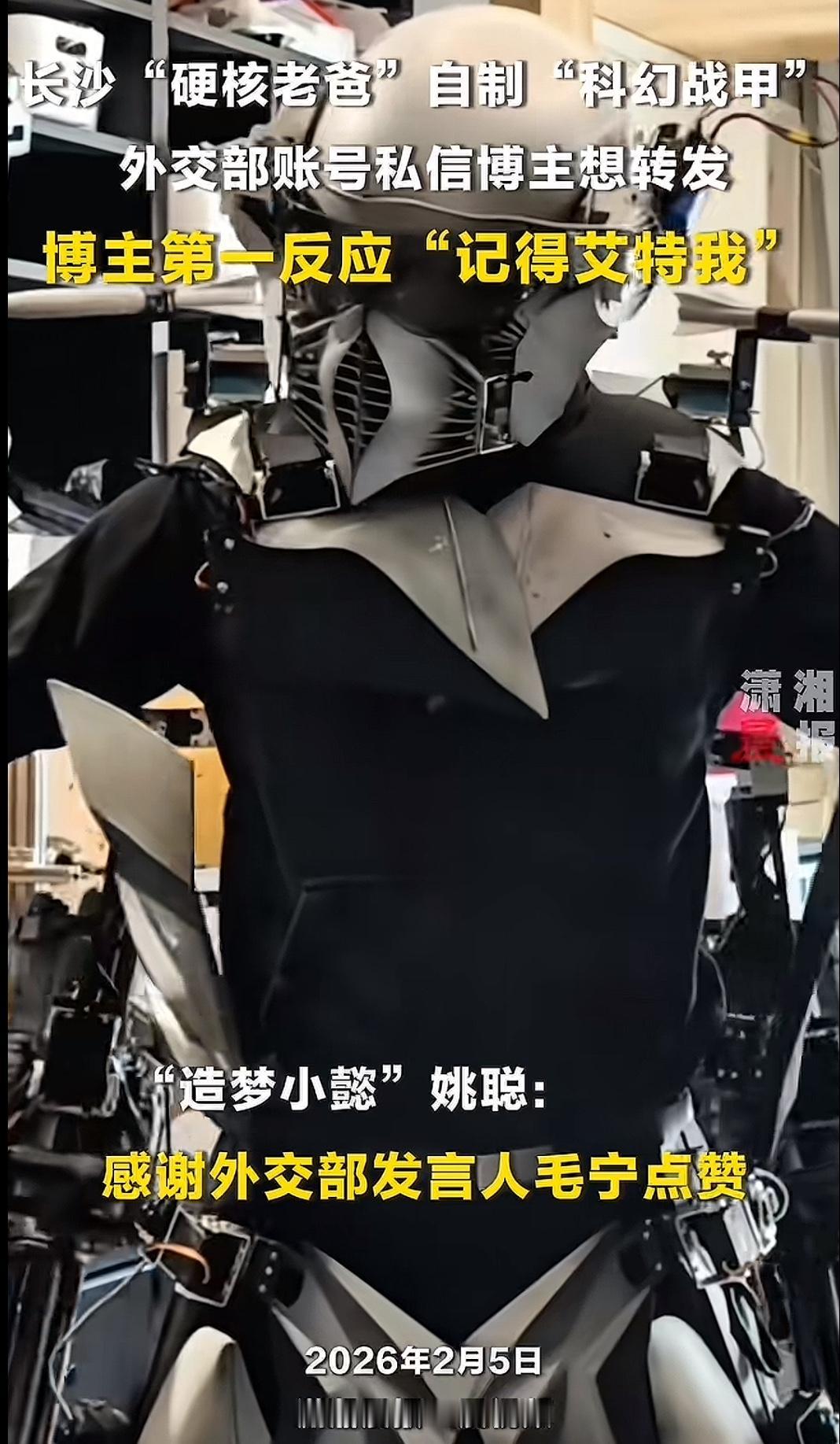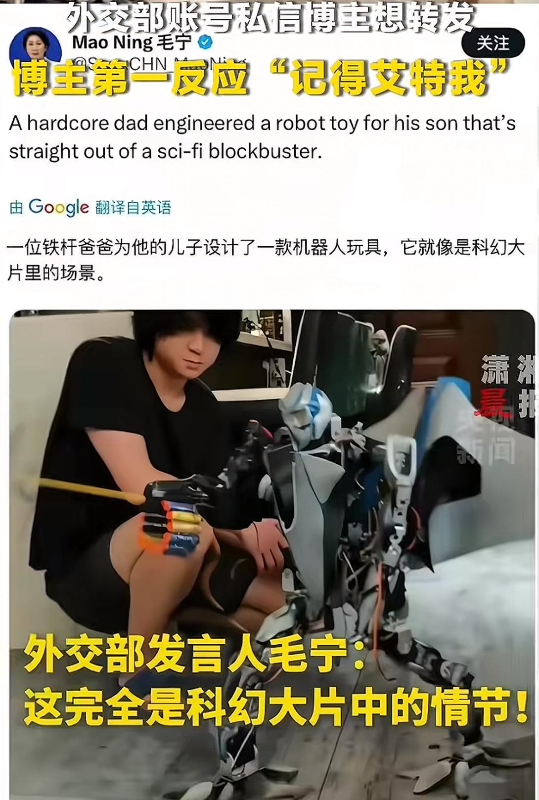 太硬核!爸爸手搓“机甲”陪娃,外交部急着私信:求转发,能艾特你吗? 湖南长沙一奶爸,直接把自家客厅变成了“军工厂”! 为了陪儿子玩,他捡来矿泉水瓶、废铁皮,硬是焊出了机械蜘蛛、磁力炮,甚至还有“钢铁侠战甲”。 本来以为只是父子俩的娱乐,没想到视频火到了国外。 外交部发言人毛宁亲自点赞:这完全是科幻大片! 更绝的是,外交部官方账号还私信求转发,态度超好地问了一句:“我们想@你,可以吗?” 一边是废品改造的硬核科技,一边是国家平台的温柔认可。 这才是中国爸爸该有的样子:平时陪娃做梦,战时一鸣惊人。 一套战甲,让外交部都为之侧目。 谁能想到,下一个改变世界的发明,会不会就诞生在这个小小的客厅里?