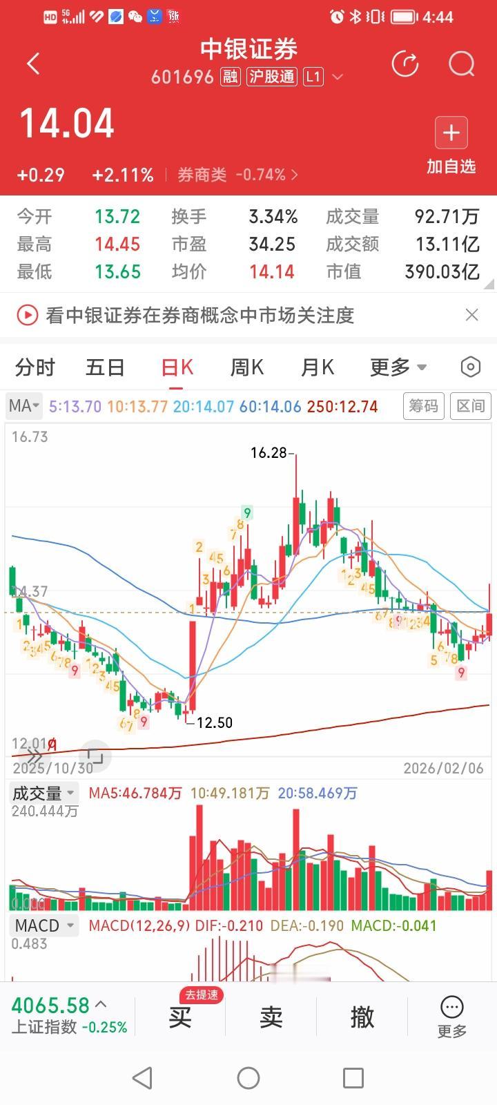 中银证券,今天收盘上涨2.11%,收盘价14.04元,涨幅居券商股涨幅排行榜第一名。 中银证券今天股价走势有两个特点: 1、股价最高冲到14.45元,一度冲上了60日均线,但冲高回落,没有有效站上60日线。 2、中银证券今天成交金额温和放大到13.11亿,也算带量上涨。 应该说中银证券走势还算强势,目前有不少头部券商股已经跌破年线,或者股价在年线附近挣扎,而中银证券目前股价远高于年线12.74元。 中银证券似乎有探底成功,股价率先回升向好之势。