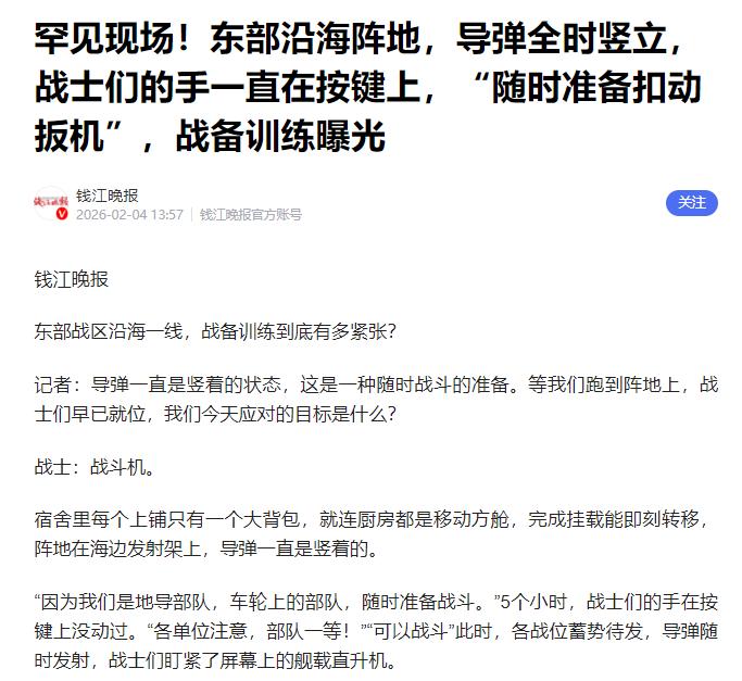 罕见现场!2月4日,央视军事披露,东部战区沿海一线紧张战备中,导弹全时竖立状态,随时准备投入战斗! 平时咱们的导弹可不会这么“显眼”,大多时候要么藏在发射车的舱里,要么躲在固定的发射井里“休眠”。一来是为了节省装备寿命,二来也是怕被外界发现,得藏得隐蔽点。 而且咱们的导弹大多用的是固体推进剂,虽说能提前装在弹体里省点准备时间,但真要发射,还是得揭伪装、起竖、加电检查、输目标数据,就算反应最快的部队,也得花上一小会儿。 这次不一样,全时竖立相当于把所有前期步骤都省了,只要有异常目标靠近,立马就能发现、锁定,半点儿危险都不耽误拦截。 之所以要搞这么罕见的战备状态,说白了就是周边这一年多来太不太平了。 刚过去的1月份,美军派了两艘船强行闯台海,一艘“约翰·菲恩”号导弹驱逐舰撑场面,另一艘“玛丽·西尔斯”号海洋测量船藏在后面搞小动作。 咱们东部战区立马组织海空兵力全程跟监,连直-10武装直升机都出动了,近距离陪着他们,最后几乎是把美舰“押送”出了海峡,这就是明摆着的警告。 去年12月咱们辽宁舰航母编队在宫古海峡以东海域正常训练,事先都公布了训练区域,结果日本自卫队的飞机多次抵近滋扰,事后还倒打一耙,炒作所谓“雷达照射”的事。 还好咱们国防部、外交部当场就驳回了,严正警告他们别瞎搞小动作。 能支撑这样高强度的全时战备,靠的不光是战士们的坚守,更靠咱们过硬的国防实力。 除了东风-26,这儿还部署了东风-21D这款“航母杀手”,它的射程能到1500到1800公里,速度超过10马赫,末段还能灵活变轨。 就算是美军的航母编队,想拦截它也难如登天,一枚命中就能瘫痪航母甲板,多枚齐射更是无解。 而且咱们还有全方位的预警侦察体系,相当于给祖国装上了“千里眼”“顺风耳”。岸基的相控阵雷达旋转精度极高,几百公里外的目标信号都能精准捕捉。 空中有空警-500A预警机全天候巡逻,这款预警机是咱们自主研制的,加装了受油管,配合运油-20空中加油,一次能在天上待12个小时以上,不间断监控空情。 海上有舰艇前出警戒,天上、海上、地面织成一张立体监控网,任何目标只要敢靠近,都绝对逃不过我们的眼睛。 我们每年的国防预算,很大一部分都用在装备维护、战士训练上,这不是浪费,而是在给14亿中国人的和平生活买“保险”。 而且大家别以为这次的全时竖立是突然之举,它其实是我们常态化战备的升级。 现在导弹全时竖立,再加上战士们随时能转移的能力,就形成了“打得了、跑得了、随时能再战”的防御体系。 我们比谁都希望和平,比谁都希望祖国早日团圆,那些扎根在前沿阵地的战士们,也和我们一样,盼着能早点和家人团聚,盼着两岸同胞能早日欢聚一堂。 但我们也清楚,和平需要靠实力守护,底线需要靠准备捍卫。 导弹竖在那里,不是好战,而是为了止战;战士们枕戈待旦,不是想打仗,而是为了让我们能安安稳稳地过日子。这就是我们的底气,也是我们守护家园的坚定信念。