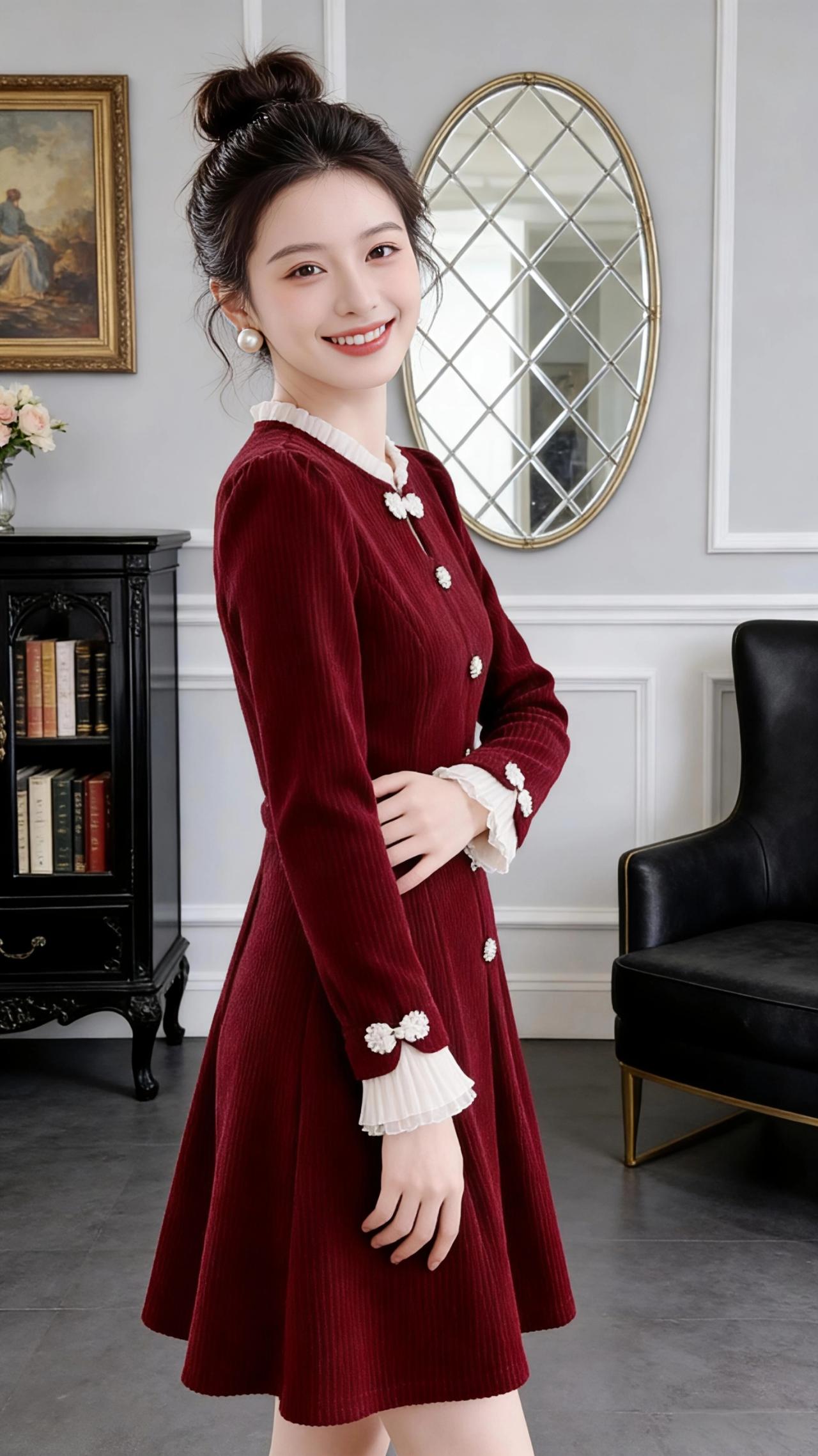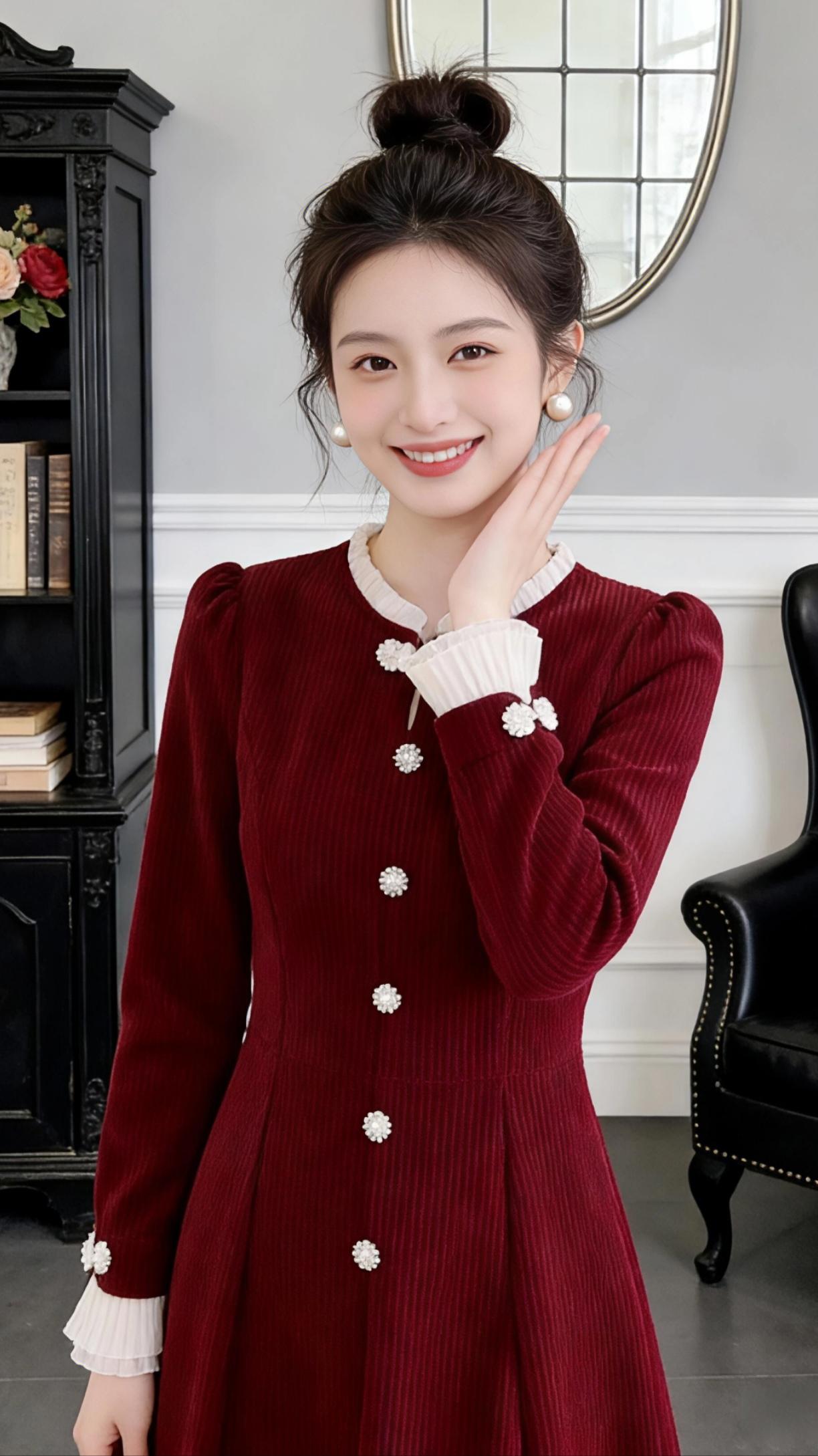 像把冬日里的浆果酿成了裙装,这抹浓郁的酒红裹着细腻的竖纹肌理,在柔和的光线下泛着绒绒的暖光。领口与袖口的米白蕾丝,是恰到好处的温柔点缀,像落了一圈细雪在衣料上,中和了酒红的浓烈。 她站在复古镜前,裙摆轻轻垂成圆润的弧度,珍珠纽扣顺着腰线排列成温柔的坐标;侧身抬手时,蕾丝袖口随着动作漾起细碎的褶皱,和领口的花边呼应出甜而不腻的精致。丸子头高高束起,露出的珍珠耳饰在光影里闪着微光,让一身复古裙装多了几分少女的灵动。 这一身没有繁复的装饰,却把复古与甜平衡得刚好——是适合圣诞夜的温柔,也是日常里的小仪式感,裹在酒红裙装里的,是每个女孩都藏着的那份精致底气。   每日搭配分享👗时尚穿搭 高级感穿搭 新年穿搭