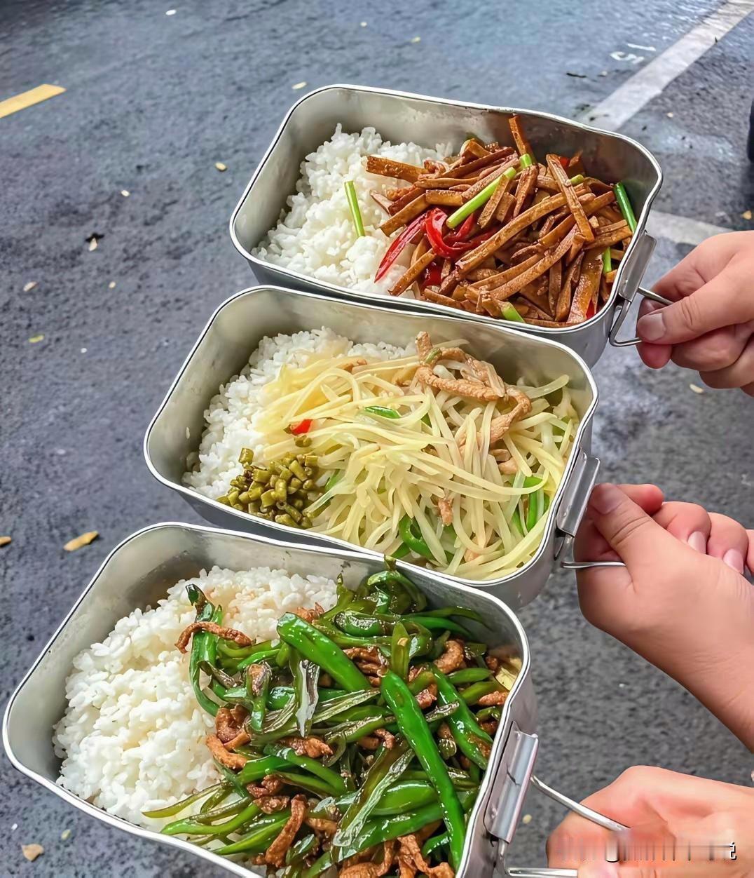 用过这种饭盒的人年龄应该不小了吧,当年念书时使用了几年,那印象实在是太深了。只不过唯一不同的是,当年饭盒里面装的可不是单锅小炒,而是大锅菜。只有偶尔改善伙食才舍得花两元钱去炒个青椒肉丝来解解馋,就像最底部的那个饭盒一样!现在看起来都觉得直流口水,总感觉那是一种情怀吧。哪怕现在每天用精美的餐盘装上青椒肉丝,都感觉没有当年用饭盒吃起来香!假如该吃晚餐了,那么这三个饭盒里的伙食让你选,你准备选哪一个?