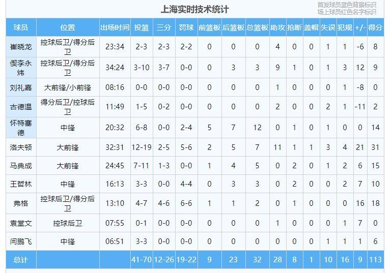 今晚俱乐部杯广东队104:113被上海队淘汰止步8强,输球的主要还是国内球员的差距,其实两支球队外援得分几乎差不多,广东队奎因得到37分,萨姆纳得到26分,两人加一起是63分,而上海队外援古德温2分,弗格18分,洛夫顿31分,怀特赛德14分,四个人一共得到65分,也就是广东队外援得分只比上海队外援少了2分。 而在国内球员方面,上海队的偰李永伟得到9分,崔晓龙得到8分,马典成得到15分,而广东队只有黄明依得到10分,其它球员几乎都没有什么机会得分,要不是最后垃圾时间张文逸投了两个三分,广东队国内球员得分更少了。