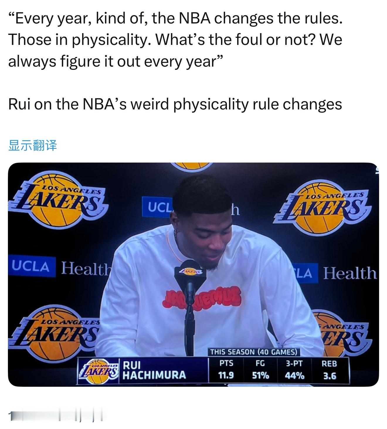 八村谈NBA奇怪的身体对抗规则变化:“NBA几乎每年都会修改规则,尤其是关于身体对抗的规则。什么算犯规什么不算犯规?我们每年都得弄清楚。”76人vs湖人