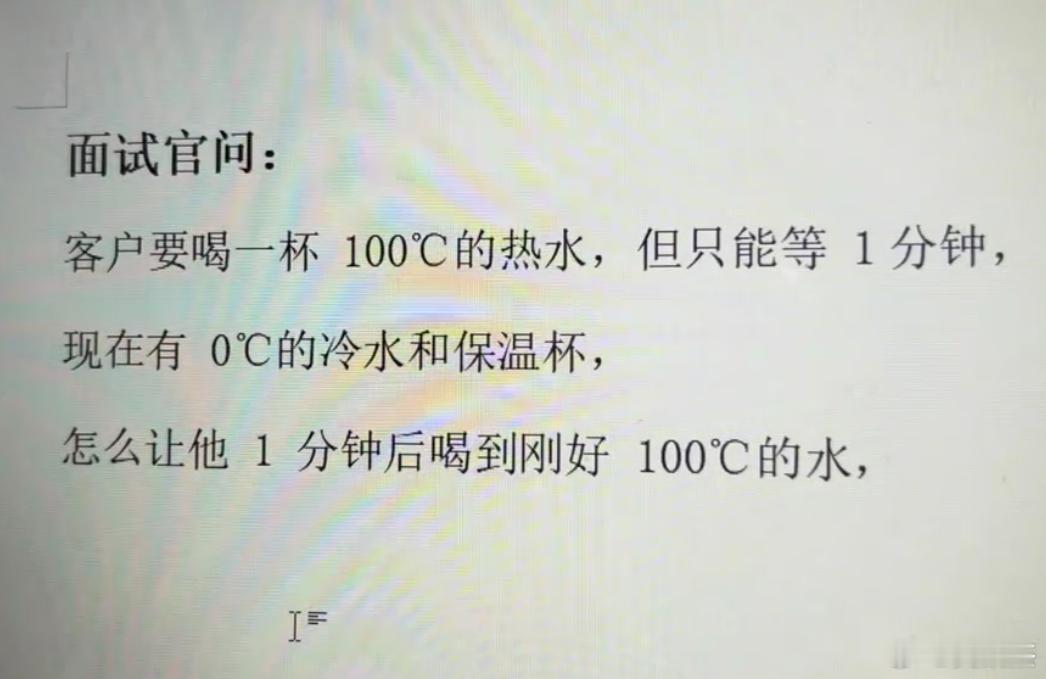 面试官问:客户要喝一杯 100℃的热水,但只能等1分钟,现在有0℃的冷水和保温杯,怎么让他1 分钟后喝到刚好 100℃的水。此时高情商你的会怎么回复?我先来:把我简历还我!