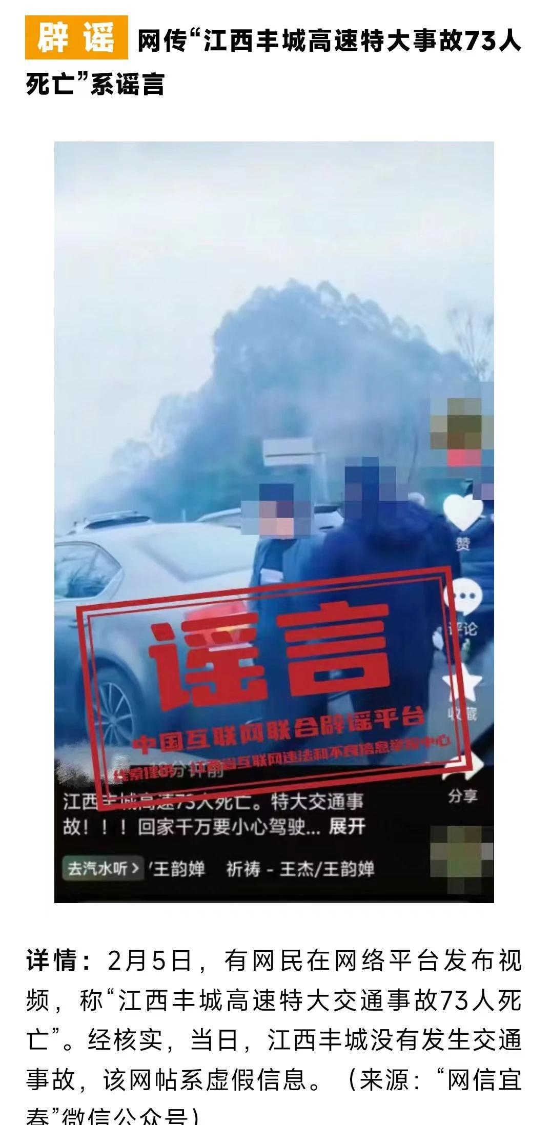 每日辟谣(2026年2月5日) 2月5日,有网民在网络平台发布视频,称“江西丰城高速特大交通事故73人死亡”。经核实,当日,江西丰城没有发生交通事故,该网帖系虚假信息。