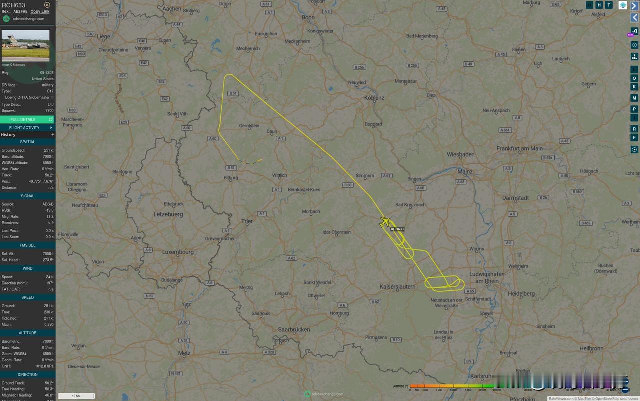 快讯:美国空军一架编号为RCH633的C-17A“环球霸王III”运输机(序列号AE2FAE)从德国施潘达勒姆空军基地起飞后,宣布发生“飞行中紧急情况”,目前正在空中盘旋消耗燃油以达到安全着陆的重量。此外,该机还面临通信故障问题,和地面沟通并不顺畅。