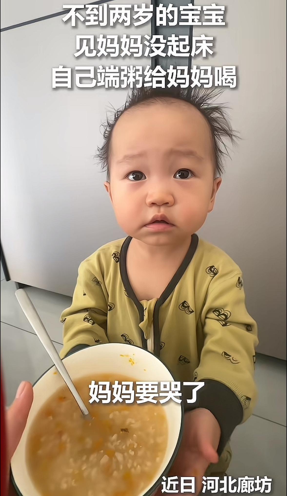 人民日报转发!河北廊坊这一幕看哭了! 2月4日,河北廊坊。一个还不到两岁的宝宝比妈妈醒得更早。他没有哭闹,也没有打扰,只是安安静静地守在一旁。 看着还在休息的妈妈,他迈着晃晃悠悠的小步子慢慢走到桌旁,伸手去端桌上的粥,两只稚嫩的小手攥着碗沿,脚步摇摇晃晃,却一步一步稳稳地朝床边走去,生怕碗里的粥洒出来。 走到妈妈面前,他仰起头,认真又温柔地喊:“妈妈吃粥,妈妈吃~” 妈妈又意外又感动,声音带着哽咽:“妈妈都要哭了,你让我起床,我不起,你就从桌子上把粥给我端来了,对吧?谢谢你!” 看着眼前这个路都还走不稳的小家伙,用最笨拙的方式惦记着自己,妈妈瞬间湿了眼眶,忍不住落下泪来。 很多时候我们都以为,是大人在守护孩子,却不知,孩子的爱,远比我们以为的更深、更真。 他们不懂表达,却把最纯粹、最直白的心意都藏在每一个小小的细节里。简简单单,却足够温暖,足够动人!