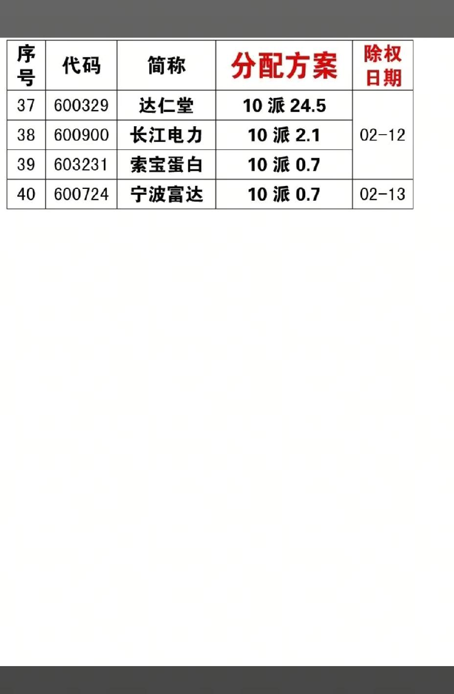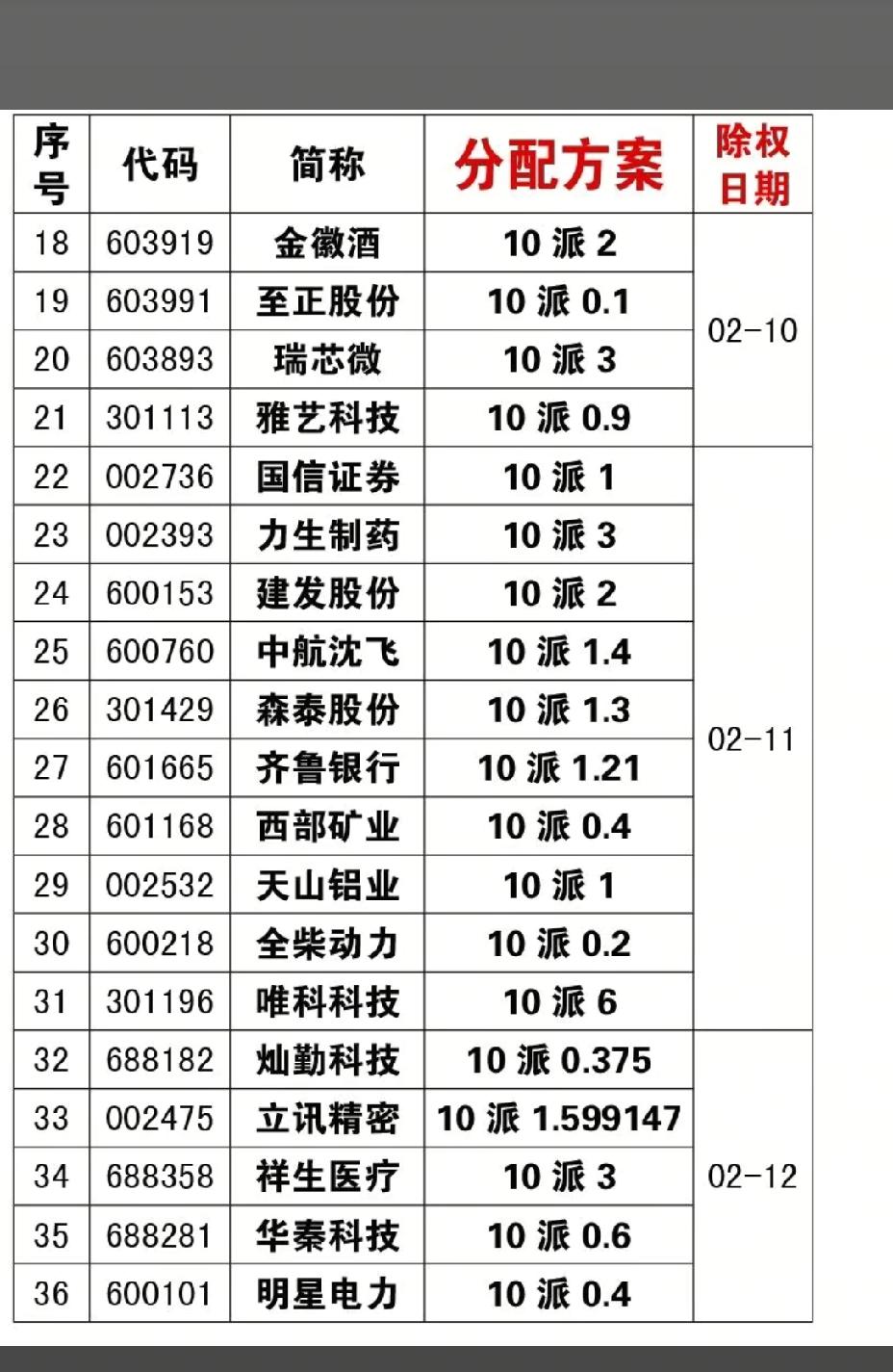 2月7日,周六,下周A股将分红的公司一览表!!! 分红一般代表着一个公司经营健康情况,以及回馈股东的相关指标,下周A股有40家公司将进行分红!!! 华信新财下周分红,分配比例10配1 ,后市值得期待;荣晟环保9号分红,分红比例10配3.8,后市值得高看一眼;唯科科技11号分红,分红比例10派6,后市值得重点关注!!!