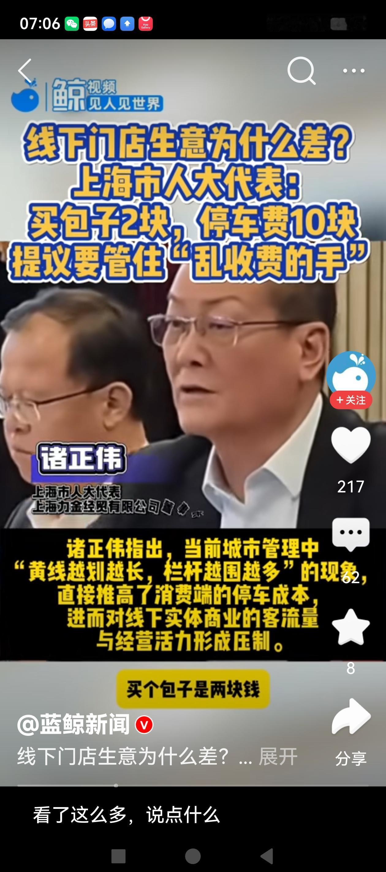 上海这位人大代表敢于直言,线下门店生意之所以差,与乱收费脱不了干系。买个包子2块钱,路边停车费却要10块钱,把城市的那种烟火气都给收走了。 人大代表指出的这一问题,直击城市治理的痛点,路边、公共区域划设车位收费,到底应不应该?有些地方甚至将此作为招商引资项目,承包给外地企业,我觉得是有些荒唐。公共空间是为全体市民共同享有的,是政府为市民提供的,不能反过来成为政府薅百姓羊毛的工具。