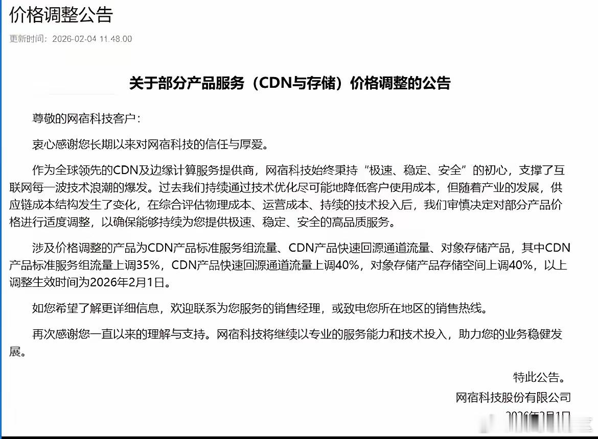 可能很多人还看不懂CDN内容分发这个赛道。2012年的移动互联网,网宿科技股价上涨了30倍,时间从2011年到2016年,而这一次的AI生成式大模型,对内容分发的需求会更高,而最近美股亚马逊,微软和谷歌的云服务都官宣涨价,而最近公司的CDN产品标准服务组流量上调35%,CDN产品快速回源通道流量上调40%,对象存储产品存储空间上调40%,这也间接说明了CDN的需求很大,而网宿科技这一波股价还未翻倍,反正我是不会走的!年前DEEPSEEK V4会推出,而阿里千问和腾讯元宝的下载量持续新高,也刺激了CDN的需求。
