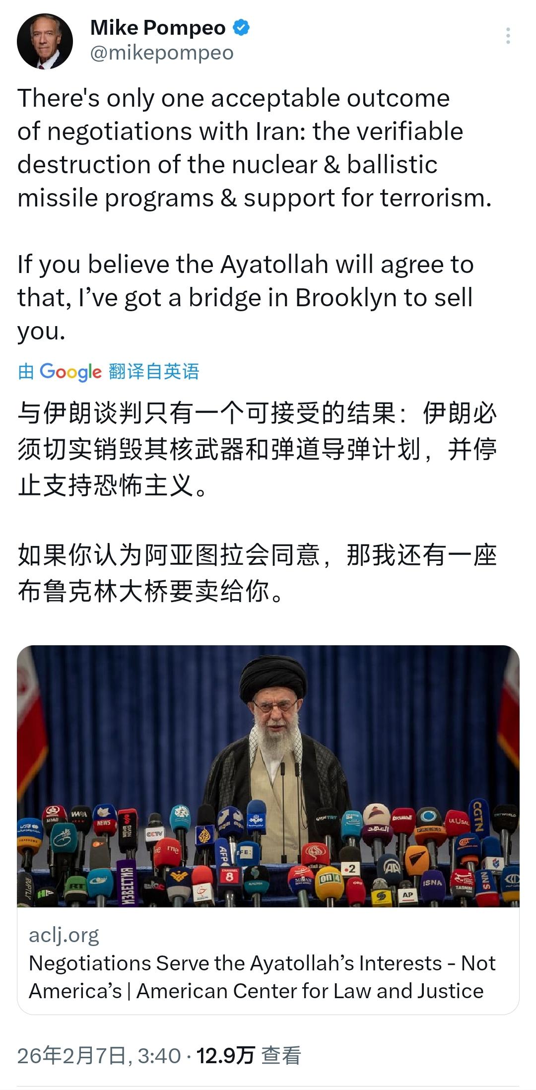 美国前国务卿蓬佩奥今天(北京时间2月7日)发文写道:“与伊朗谈判只有一个可接受的结果:伊朗必须切实销毁其核武器和弹道导弹计划,并停止支持恐怖主义。如果你认为阿亚图拉会同意,那我还有一座布鲁克林大桥要卖给你。” 【蓬佩奥转发了自己在aclj的文章:《谈判符合阿亚图拉的利益,而非美国的利益》】 [机智]评几句:蓬佩奥从始至终都非常仇视伊朗,他心底里就不希望美伊达成任何谈判与缓和,一心只想推动美国彻底推翻伊朗政权。蓬佩奥所谓的谈判条件不过是故意设置的不可能完成的门槛,用“布鲁克林大桥要卖给你”这句俚语嘲讽伊朗不会妥协,实则是他自己在兜售极端对抗的政治谎言,刻意堵死外交空间。所谓“只接受一种结果”,不过是霸权主义的蛮横表态,既暴露了其极端鹰派的真实面目,也让外界看清美国强硬派始终不愿放弃政权更迭的险恶用心。谈判只是幌子,搞垮伊朗才是终极目的。
