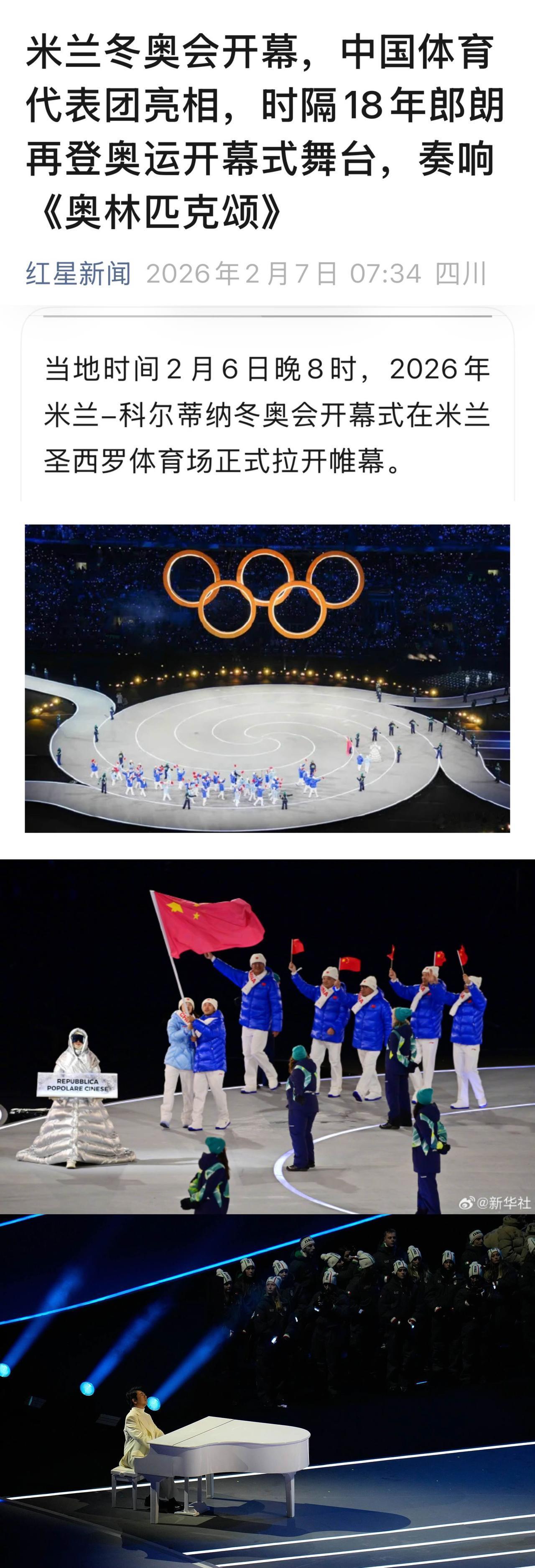 在2026年冬奥会开幕式上,中国钢琴家郎朗在升旗仪式中演奏了《奥林匹克颂》。 继2008年北京奥运会后,这是他时隔18年再次在奥运开幕式上表演。此次他与意大利女中音巴托利及斯卡拉歌剧院儿童合唱团合作演出。