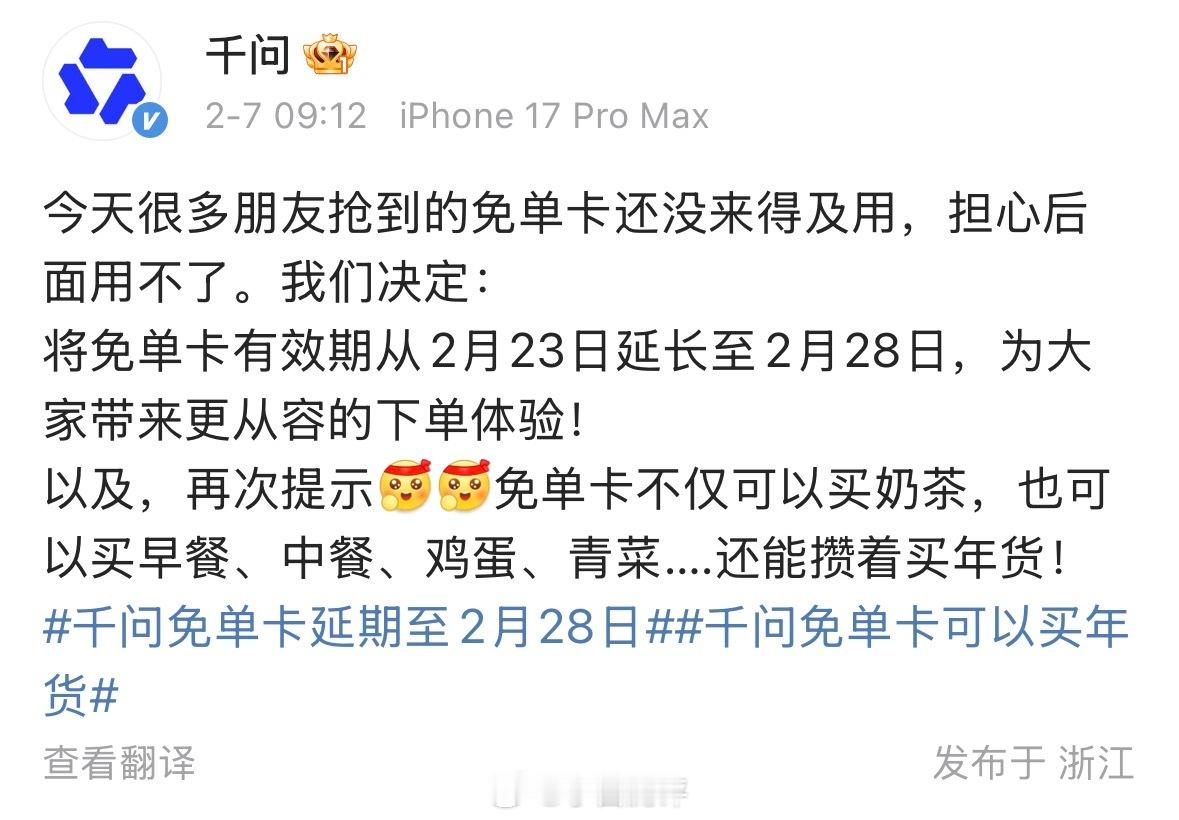 千问免单卡延长至2月28日