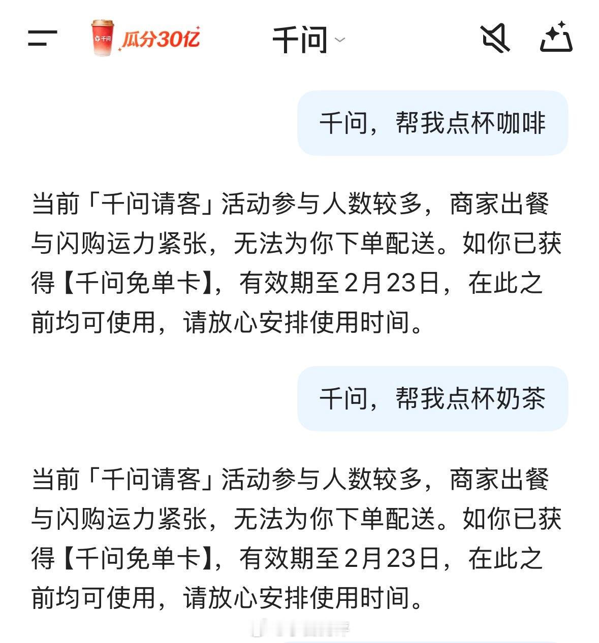 千问 今天早上用千问免单卡还是显示人数较多运力紧张无法下单