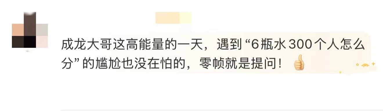 成龙6瓶水300个人怎么分啊 被成龙大哥这波灵魂提问可爱到了!这哪里是工作生活难题,分明是智慧闪光和超级接地气的“萌新”日常。300个人分6瓶水,这题我会答:答案就是大哥您一出场,大家光顾着尖叫都顾不上喝水了! 这波高能提问,完美诠释了什么叫“知识不等人,但快乐随时在线”。
