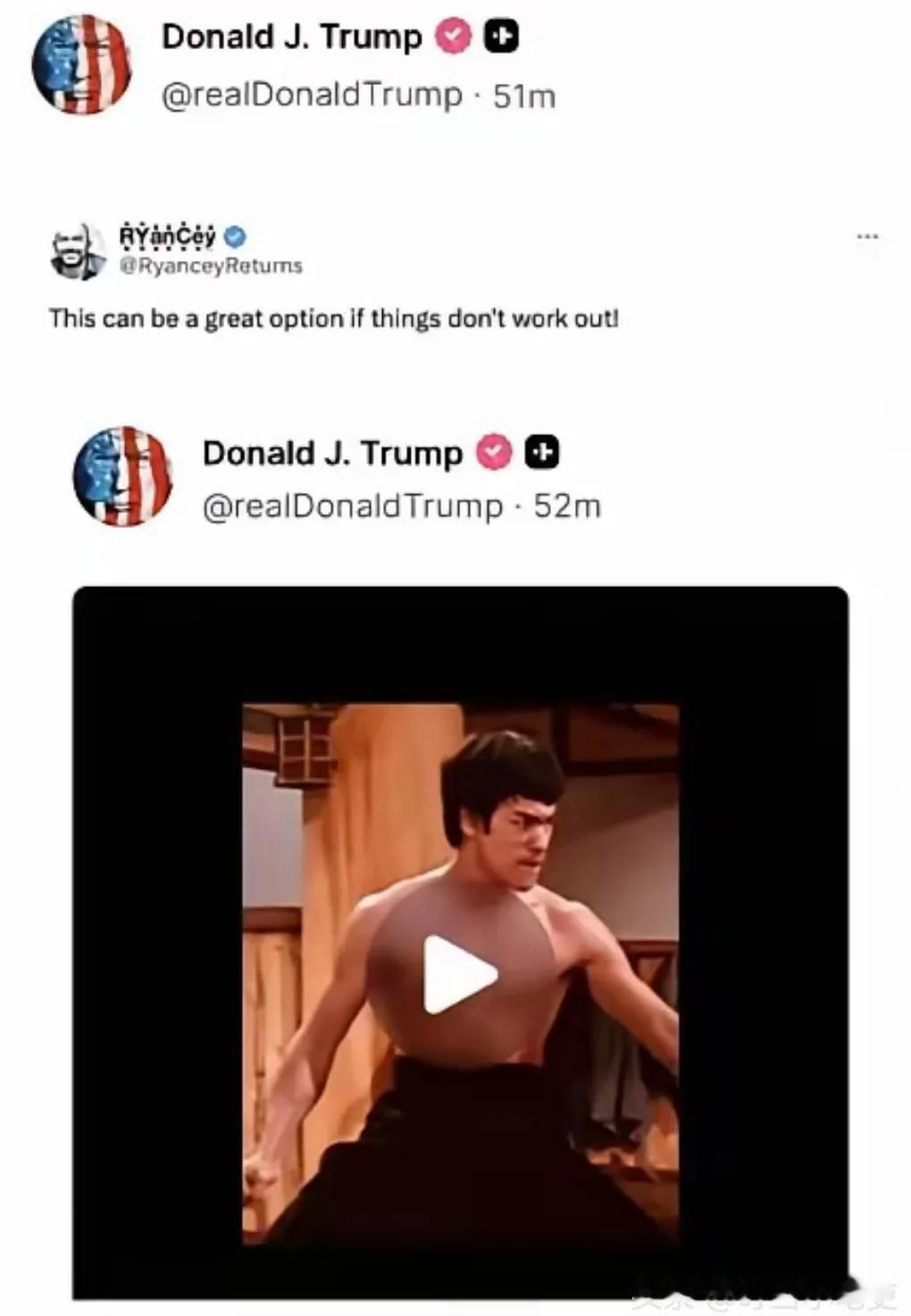 “如果事情没有成功,这可能是一个很好的选择。”特朗普昨天在社交媒体上表示,并配发了一张布鲁斯•李(李小龙)正在动手的图片。 简单一句英文,再加上功夫巨星的截图,足以说明特朗普的言下之意,就是正在阿曼进行的美伊会谈,如果双方谈不拢,美国就动手。 表达言简意赅,不拖泥带水,这样的发文,倒显得特朗普有时候还挺有才的。