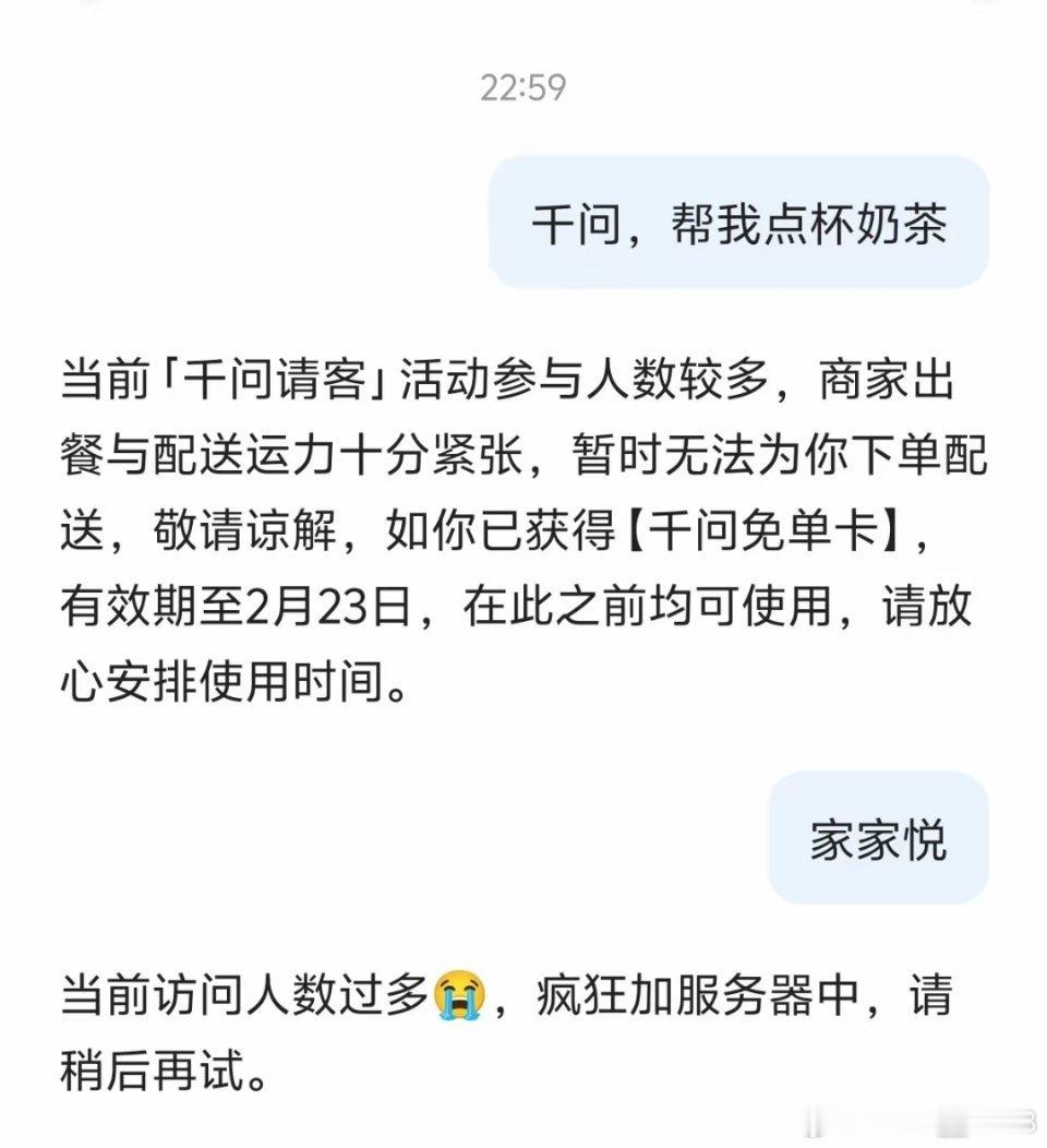 千问服务器现在已经正常了,但现在还是点不了外卖,估计这不是千问的问题,是淘宝闪购跟不上了。