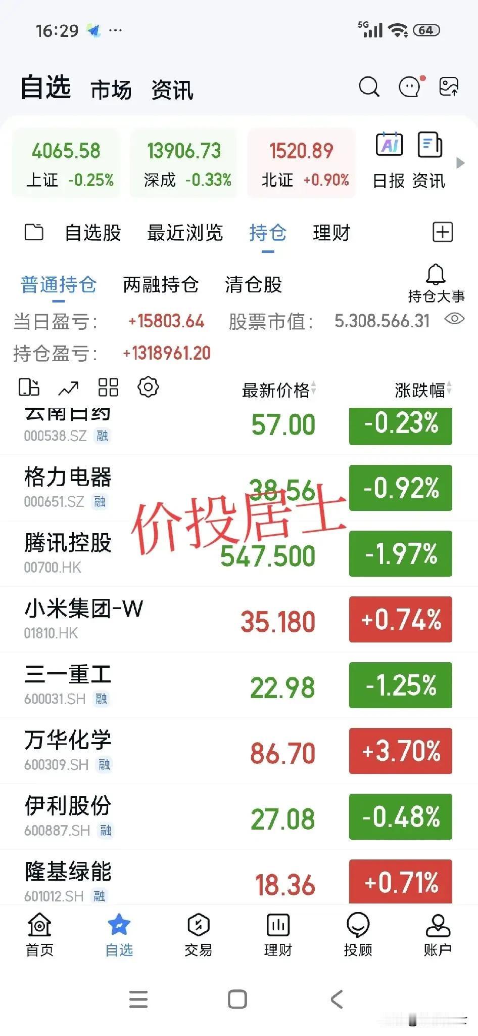 其实很多朋友都忽略一个问题,那就是老拿短期股价来评论我一个价值投资者,这本来就是不符合逻辑的。 就像我一直说短期的股价涨跌和我没关系,然而很多朋友都要拿短期的股价往我身上扯,这叫我如何回答呢[笑哭] 对我来说,就是持有些自己能看懂的好公司,不想理会股市里的涨涨跌跌,任它潮起潮落,我自心如止水[祈祷] 我也挺好奇的,为什么如此简单的事情,那么多人要整的如此复杂[笑哭]本人虽然没什么本事,然而也是白手起家,原本我出学校门就是两手空空的,我现在有的都是我赚到的,我很知足[笑哭]谁想短期之内赚大钱的,想一夜暴富的抓紧去,别耽误你们发大财[笑哭][祈祷]