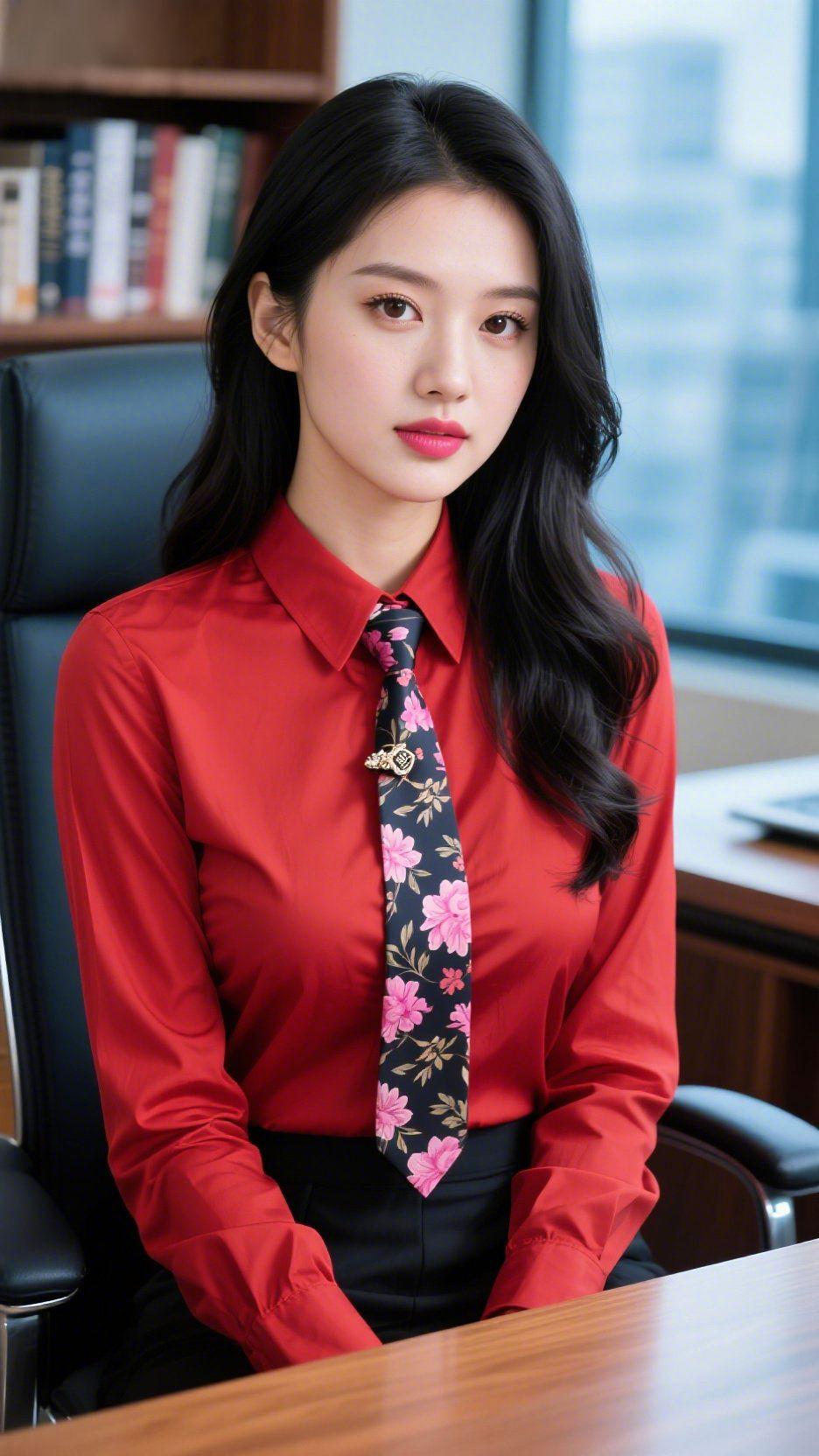 《红衫衬职场柔光》 写字楼窗透进浅亮的光,落于她的正红衬衫上,似将晨间云霞裁作衣料。领口的花饰领带,是暗底里漾开的柔,粉瓣与金枝缠成轻缓韵致,中和了职场的利落。 长发垂落肩侧,发梢漾着软弧,衬得唇间粉意,是办公间里悄悄漫开的暖。她静坐桌前,姿态裹着舒展的稳——并非刻板凌厉,是把柔意织入干练,让职场日常也浸着轻软的光。 原来职场穿搭从不是非黑即白的刚硬,是让雅致落进妥帖剪裁里,每一眼都透着“柔而不怯”的舒展。这是职场人的温柔底气,把从容穿在身上,把暖意藏在细节中。 职场柔雅穿搭 红衫职场风