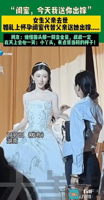 “闺蜜,我来送你出嫁!”湖南,一场婚礼上,闺蜜身穿白衬衫扎进西裤,衬衫下塞出圆鼓鼓的“将军肚”,手腕上戴着佛珠手串,手里拎着一个公文包。直到新娘该出场时,她才最先走出来,自然地站到新娘身边,代替新娘父亲挽着新娘稳稳走过红毯! 来源:【河南民生频道】 婚礼对于大多数人而言,是家庭团聚的仪式。然而对于这位新娘来说,他的父亲已经去世,无法见证女儿生命中这一重要时刻。父亲无法到场也成为心中无法弥补的遗憾! 在传统的中式婚礼中,父亲牵着女儿的手走过红毯,再将她的手郑重交到新郎手中,象征着家庭的传承与责任的转移。这一环节的缺失,往往让婚礼留下难以弥补的情感空缺! 就在婚礼前夕,新娘的闺蜜得知了这一遗憾。她做出了一个决定:代替新娘的父亲送她出嫁! 这位闺蜜正处于怀孕期,她灵机一动,利用自己隆起的肚子扮演“大肚男人”的形象! 她没有提前张扬自己的计划,直到婚礼当天,她才悄悄装扮起来。 白衬衫、西裤、公文包、佛珠手串,这些细节都透露出她对模仿长辈形象的用心! 当新娘看到闺蜜以这样的形象出现在自己身边时,立即明白了她的用意。这个从小一起长大的朋友,正代替父亲陪她走完出嫁前的最后一段路! 闺蜜挽着新娘的手,一步步走得很稳,就像真正的长辈那样,郑重地将新娘的手交到新郎手里! 任务完成后,闺蜜转身退场,脸上挂着笑容,眼泪却掉了下来! 回眸的一刻,她既有替朋友高兴的心情,也有对叔叔的怀念,还有完成一件重要事情后的如释重负! 婚礼现场很多人都看懂了这一幕,纷纷感动得抹起了眼泪。视频传到网上后,无数网友被这份真挚情谊打动,许多人想起了自己生命中那些“平时互损,遇事比谁都急”的朋友! 有网友所说:“真朋友并不需要天天见面,却在你人生的重要关口,默默站到了那个最该站的位置!” 有网友评论:“这才是真闺蜜,在关键时刻能挺身而出”! 还有有网友留言:“谁懂回头那一刻含金量,叔叔一定在天上会心一笑”! 这场特别的送嫁之所以触动人心,是因为它触及了现代人情感关系中的核心需求。在日益快节奏和功利化的社会环境中,真挚持久的友情显得尤为珍贵! 这段友情经得起时间考验,也能扛得住生活的风雨。 闺蜜怀孕的身体不仅填补了父亲形象的缺失,更象征着新生命的延续与希望的传递!