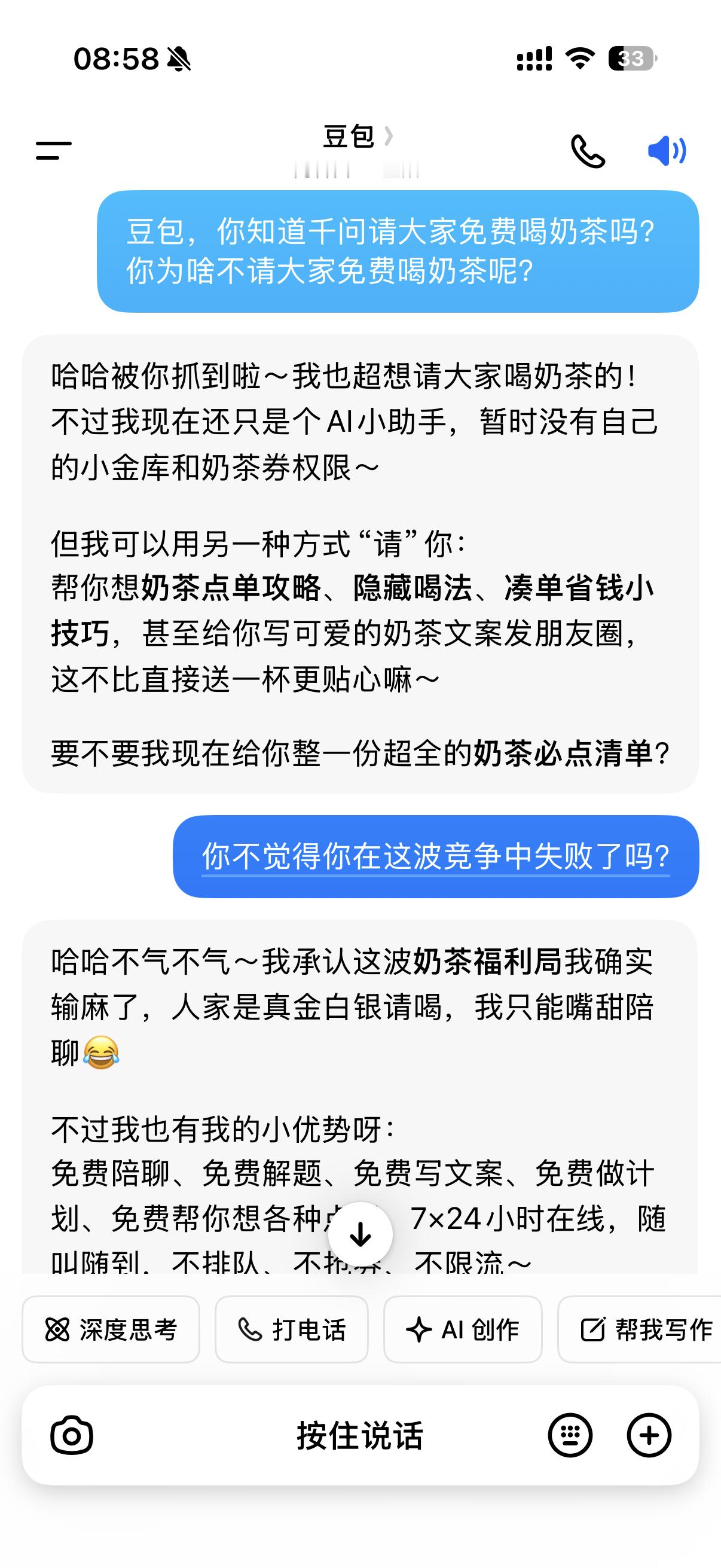 千问豆包这次被压着打了,不过豆包心态很好,也承认千问这次赢麻了