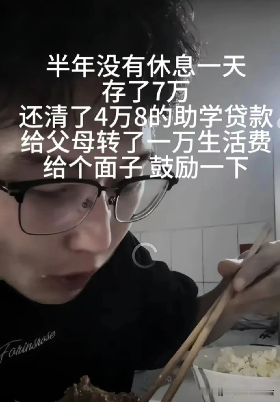 半年没休息一天,存了7万,还清了4万8的助学贷款。给父母转了1万的生活费,希望大家都能给这个小伙子打气加油!谢谢点赞! 你挺优秀的!别的同龄人还在啃老,你却用半年的时间,自己工作还清了助学贷款,并给了父母1万生活费。你真了不起!o 帅哥你的这种精神,值得很多人学习,特别是那些高不成低不就的同学都值得拥有。 在同龄中米已经超过很多人了,你就是最亮的星星,虽然我的出身不同,但是社会对每个人都是很公平。不要觉得自己比不上别人,其实你是最棒最厉害的。 你真是有责任心有孝心的好孩子,但也要注意劳逸结合哦,身体是革命的本钱,不要太累了,太透支生命会影响健康的,祝你好运连连,事事顺心。 网友说:帅哥,你太能吃苦了!你已经很努力了,自己有了自力更生的能力而且很强,!令人佩服,!账还完了,钱慢慢赚,以后赚钱的机会还有很多,不要太劳累,人要健健康康的,才能赚更多的钱,才能有美好的生活。