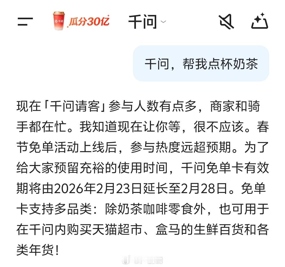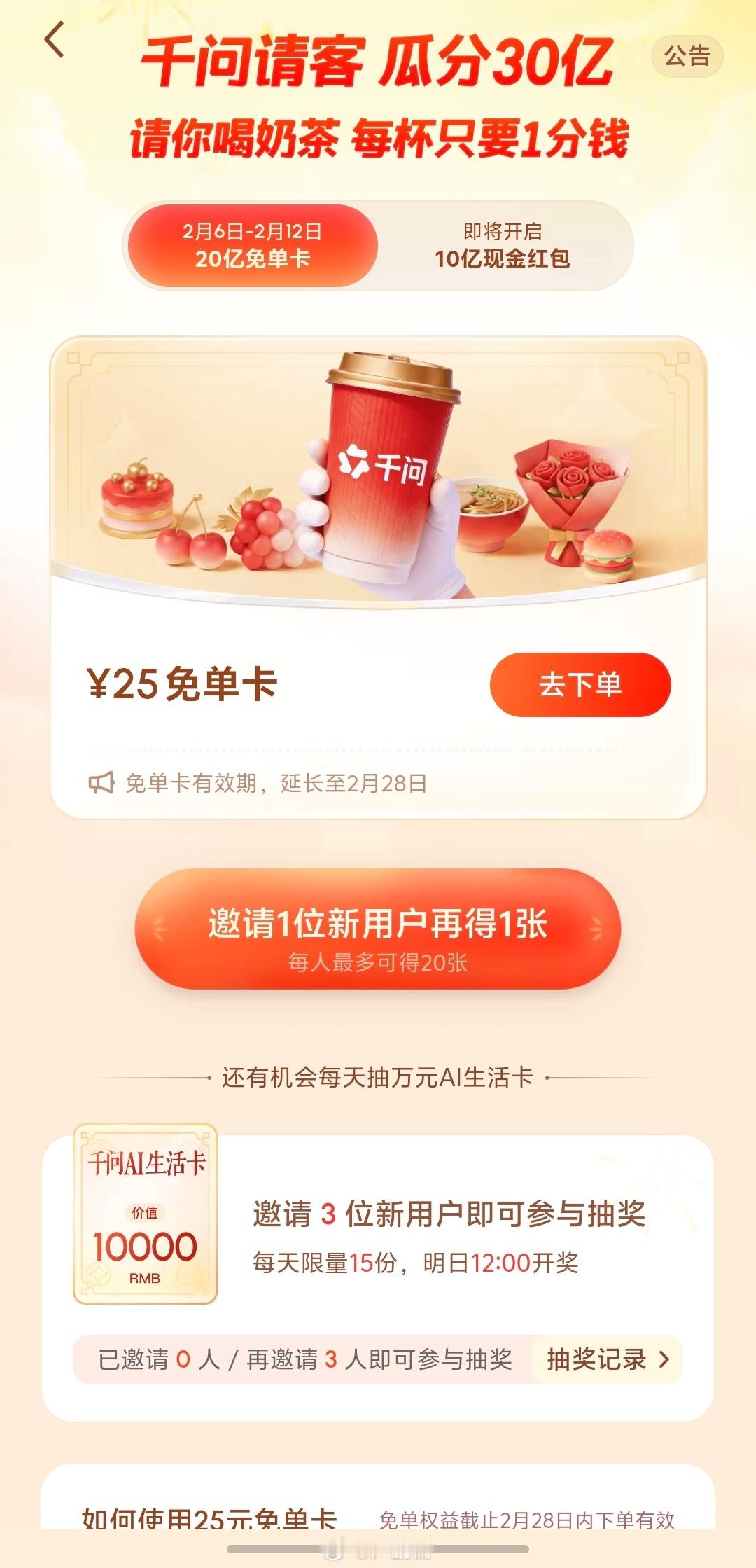 千问春节福利大放送!现在只要对千问说一句“帮我点杯奶茶”,就能领25元免单卡!🥤