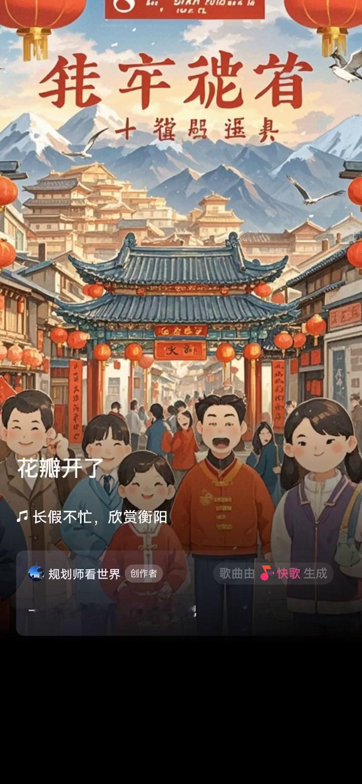 长假不忙,欣赏衡阳规划师看世界创作者。歌曲由快歌生成,一起来听听我创作的歌曲。 花开富贵吉祥年年,大大小小小上海大笑,蹦蹦跳跳蹦跳南岳北闹,欢欢乐乐欢天喜地南雁北眺,来来往往来往解放路妙,老老少少少力老嘈。 花瓣开了,世界多彩了,雁城眉开眼笑了,透红茫茫大地,透红朗朗长空,灯红酒绿幸福年年,大大小小小上海大笑,蹦蹦跳跳蹦跳南岳北闹,欢欢乐乐欢天喜地南雁北眺,来来往往来往解放路妙,老老少少少力老嘈。 熙熙攘攘熙攘东洲岛西湖公园耀,形形色色形喜色染江东城西飙,感感想想感想雨母山辽,春来了,花瓣开了,世界多彩了,雁城眉开眼笑了。 快歌ID:193111163,更多精彩内容上快歌,用音乐表达生活。