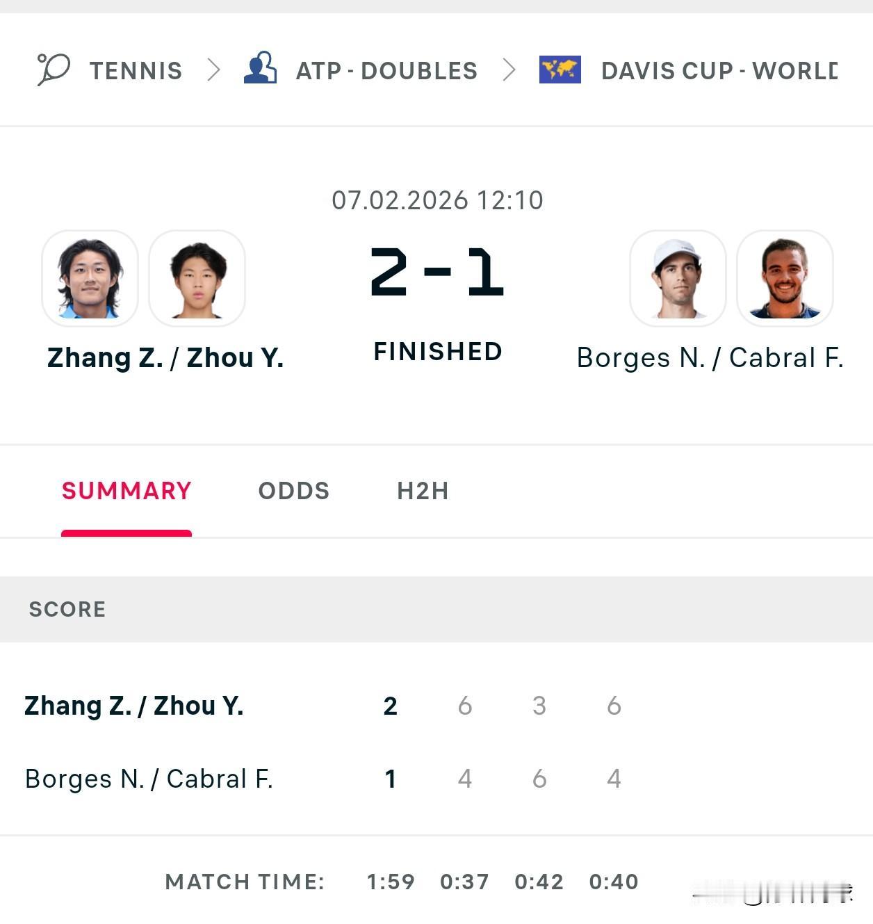 张之臻/周意2-1葡萄牙组合 目前戴维斯杯中国大比分2-1葡萄牙。 第四场,张之臻vs博尔热斯 首盘张之臻7-5拿下。 此战若获胜中国将以3-1晋级世界1组。 网坛风云