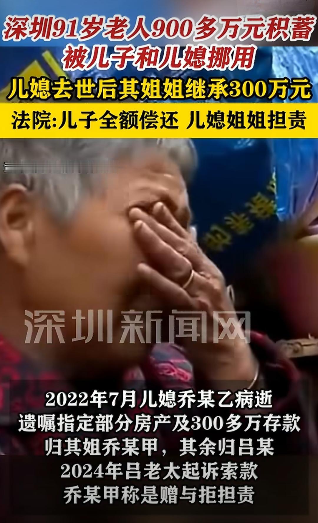 深圳法院审理的这起老人养老钱纠纷案件,让不少人直呼揪心,91岁的吕老太将近千万积蓄交给儿子保管,最后却闹上法庭,钱款的归属和偿还问题也成了案件的焦点。吕老太年纪大了,想着把自己的近千万积蓄转存到儿子吕某的账户里委托保管,本是出于对亲生儿子的信任,觉得交给家人打理既放心又省心,却没想到这笔钱后续会引发一系列的纠纷。儿子吕某在和妻子乔某乙的婚姻存续期间,并没有将这笔钱妥善保管,而是把母亲的积蓄拿出来,用于偿还家里的房贷、日常家庭开销,还有房屋装修等各项支出,就这样把吕老太的近千万养老钱慢慢花用殆尽。 谁料之后儿媳乔某乙突发疾病离世,她生前立下了遗嘱,在遗嘱里明确指定,将自己名下的部分房产以及三百多万元的存款都留给自己的姐姐乔某甲,剩下的财产则归丈夫吕某所有。这份遗嘱的出现,让本就牵扯不清的钱款问题变得更加复杂,吕老太看着自己的养老钱被儿子一家花用,如今儿媳又把部分财产留给了娘家姐姐,自己却落得两手空空,无奈之下在后续将相关人员起诉至法院,要求追回属于自己的近千万积蓄。 庭审过程中,各方说法不一,乔某甲表示自己得到的财产是妹妹的赠与,拒绝为此承担任何责任,这也让案件的审理陷入了争议。法院在审理过程中,结合双方提供的证据和实际情况进行了细致研判,法院认为,吕老太将钱款转给儿子,双方之间没有借贷凭证,无法构成借贷关系,而吕老太和儿子也都否认存在赠与行为,综合各项证据,最终认定吕老太和儿子之间成立合法的保管关系。 既然是保管关系,那儿子吕某在婚姻存续期间,擅自使用母亲的保管钱款用于家庭开支,这笔债务就属于夫妻共同债务。基于此,法院做出了最终判决,要求吕某向母亲吕老太偿还九百多万元的钱款,而乔某甲作为儿媳遗产的继承人,需要在自己继承的财产范围内,承担相应的清偿责任。【
