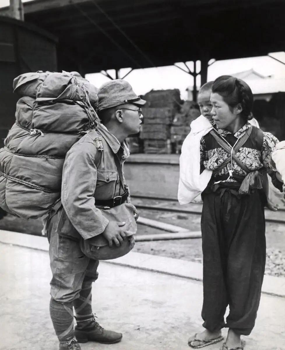 这张所谓“温情”的离别照,扒开外皮,全是讽刺与荒唐。看似是妻儿不舍、丈夫离愁,实则是一场罪恶战争里,最可笑又最可悲的自我感动。 镜头里的日本士兵,背着行囊,一副依依不舍的模样,对面的妻儿满眼愁绪,乍一看像极了乱世里身不由己的普通人。可没人会忘记,他背上的行囊、身上的军装,是要踏往别国的土地,是要去烧杀抢掠,是要把无数个和他妻儿一样的家庭,推向家破人亡的深渊。 他舍不得自己的孩子,却要去残害别国的孩童;他放不下自己的妻子,却要毁灭别国的家园。一边在自家车站演绎着骨肉分离的悲情,一边在他国领土上做着罄竹难书的恶事,这份“深情”,廉价又虚伪,令人作呕。 军国主义把普通人变成刽子手,而他们流的眼泪,道不尽自私,藏满了双标。他们的离别是悲情,被侵略民族的流离失所,却从不在他们的眼里。 这从不是值得同情的离别,这是侵略者自带的、最讽刺的悲剧。从来没有无辜的战争狂欢,欠下的血债,再煽情的眼泪,也洗不清。