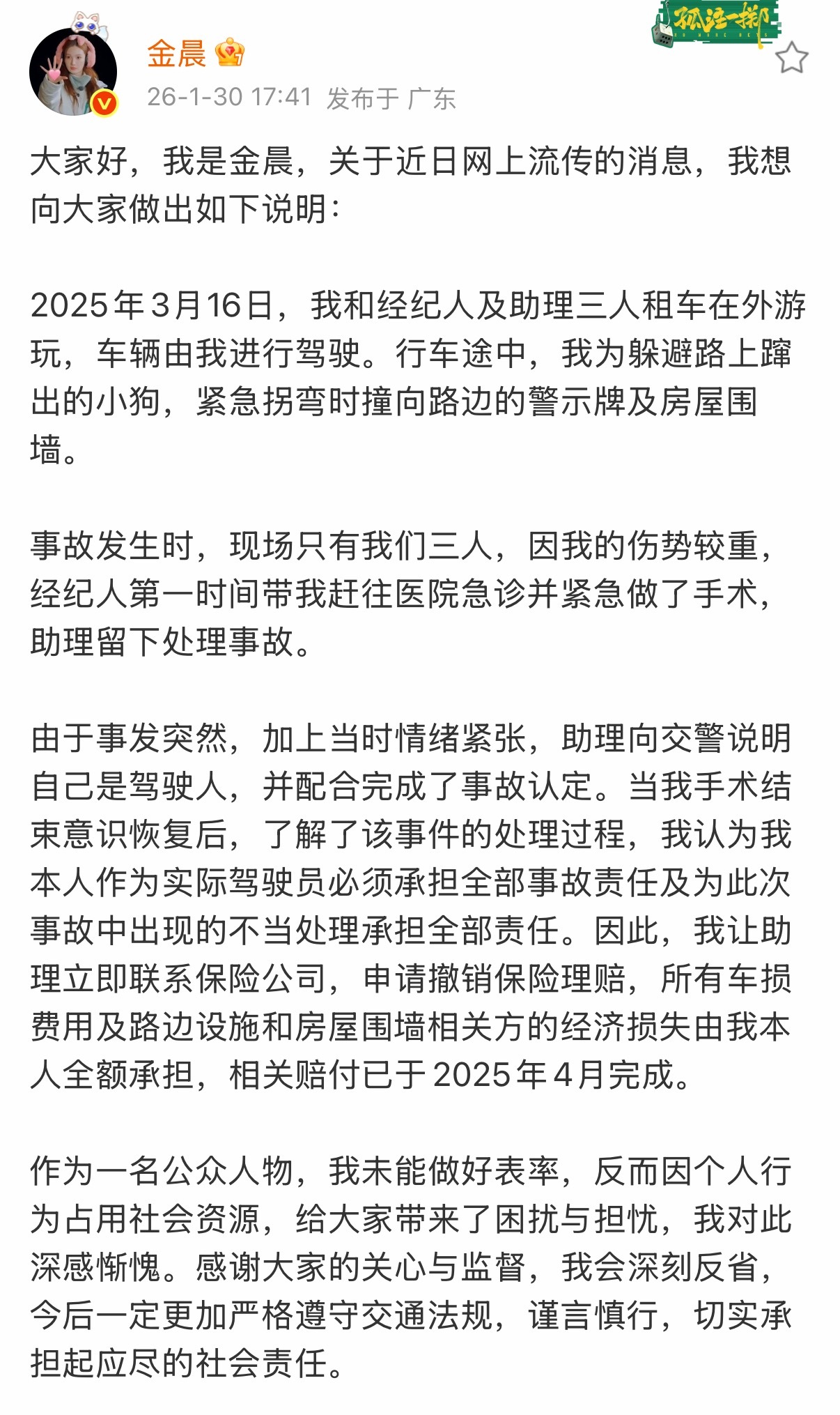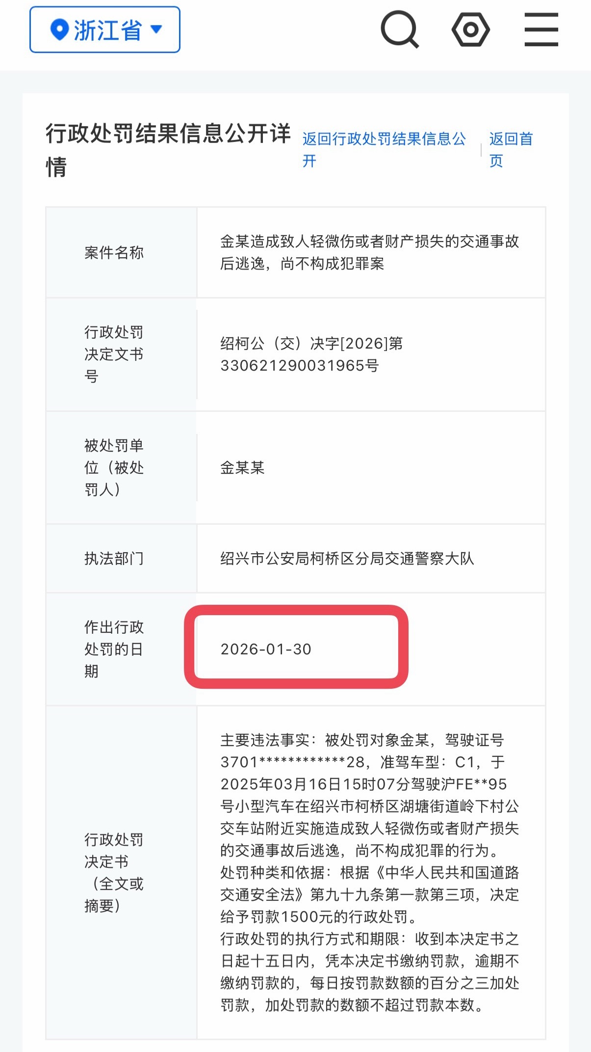 金晨肇事逃逸被罚1500元这不是去年的交通事故吗?为什么处罚日期是26年1月30