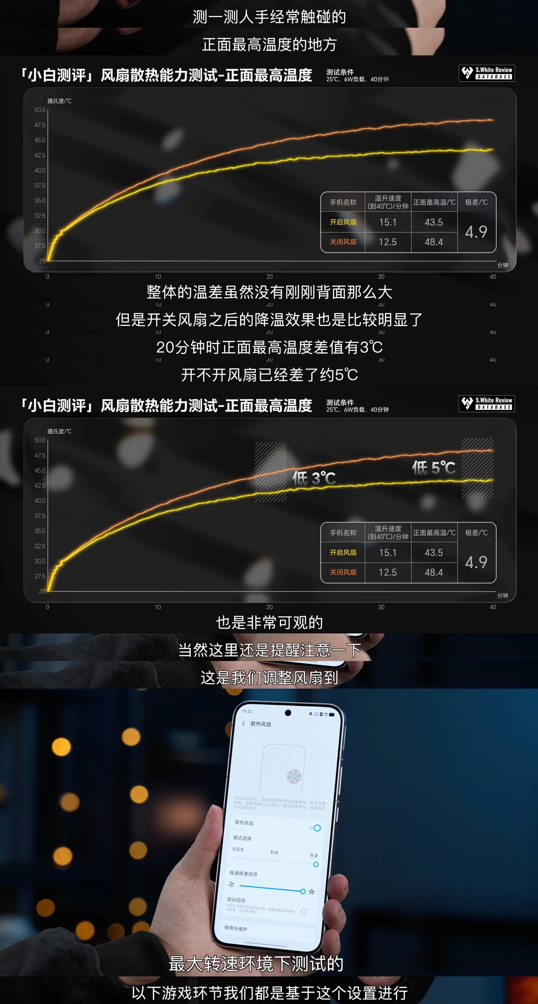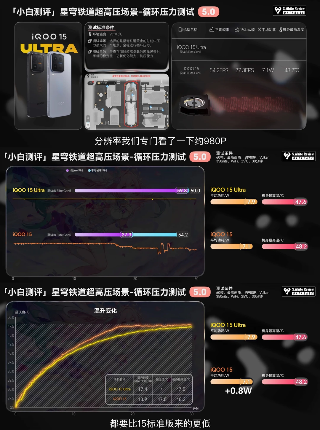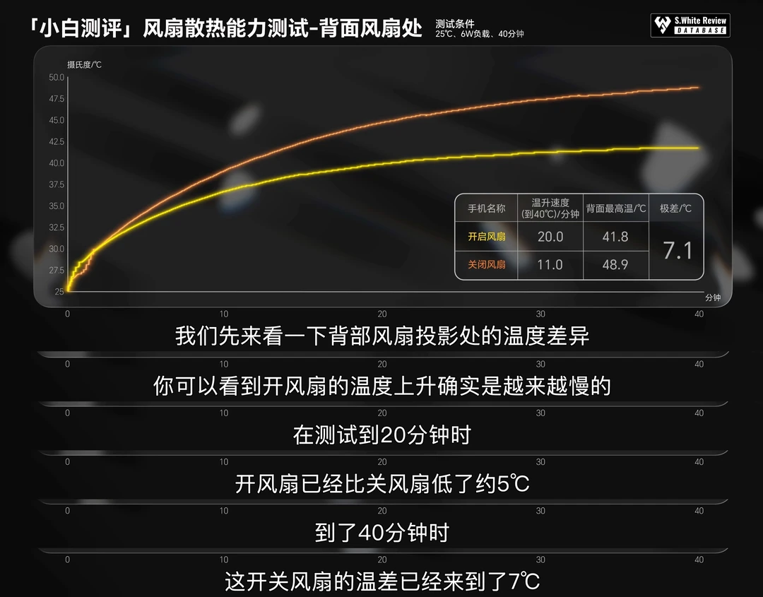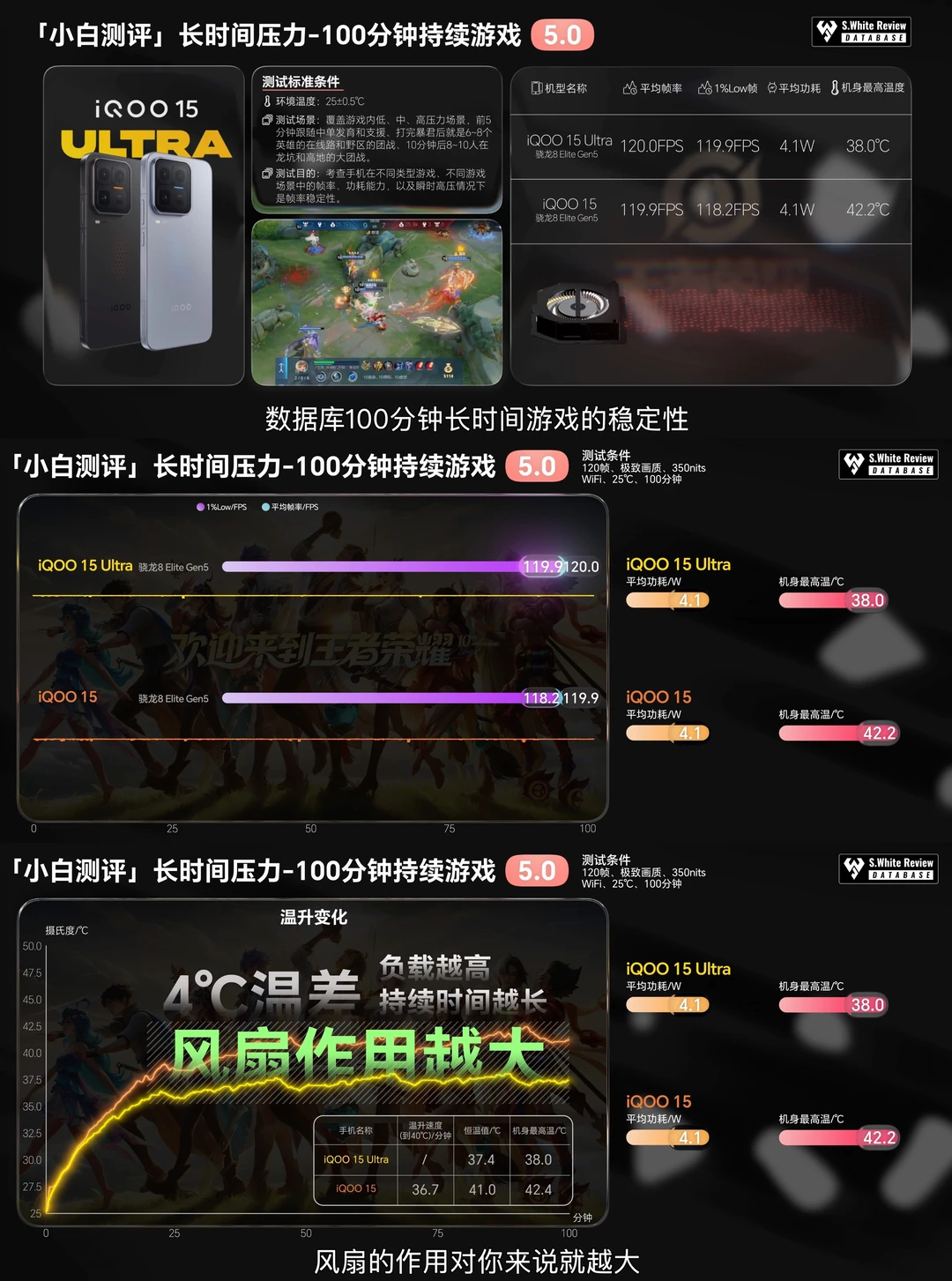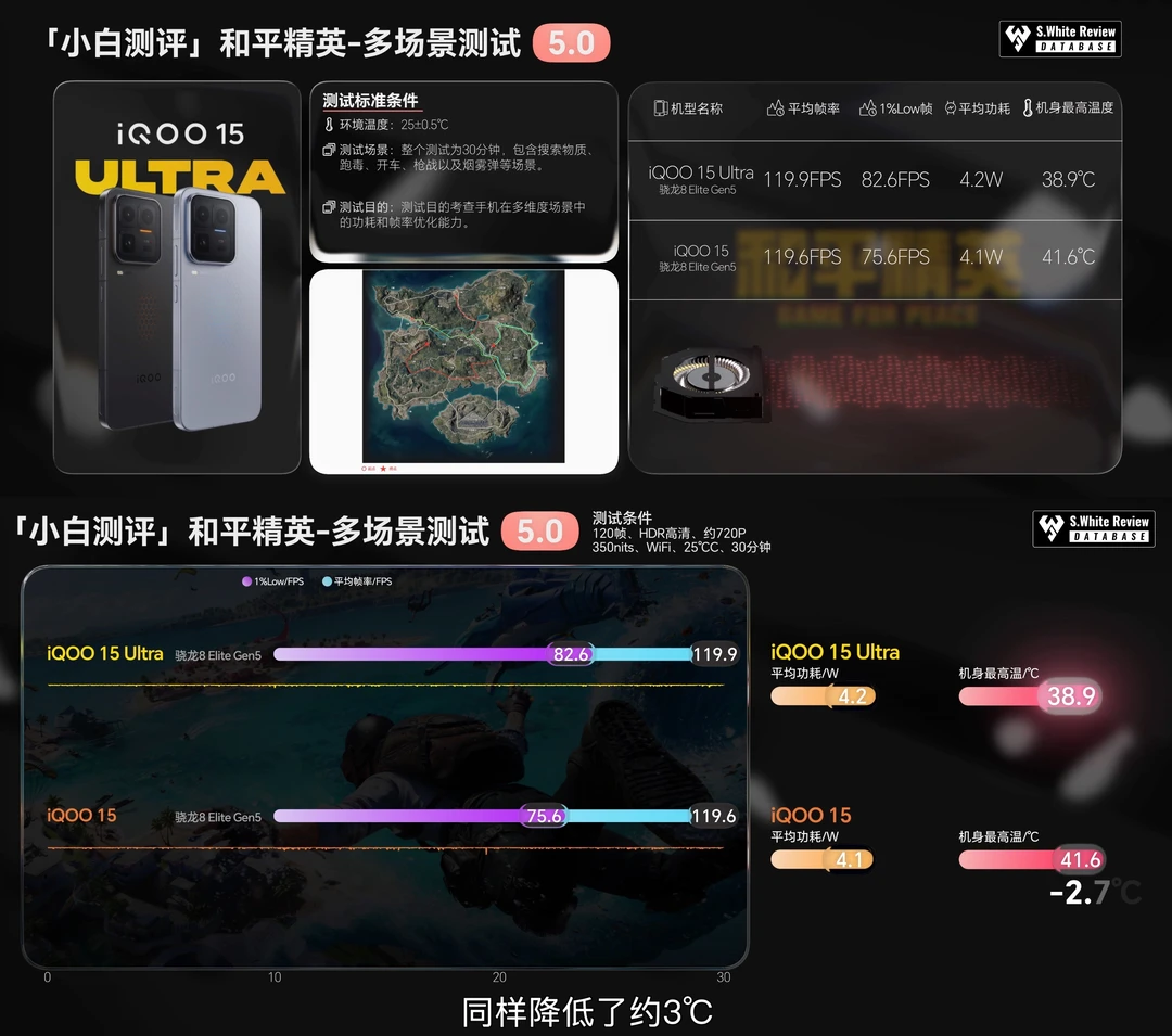 🔋 续航:实测配备7400mAh电池和100W有线充电的iQOO 15 Ultra在小白测评数据库5 模型下三小时综合续航测试剩余电量73%,六小时重度续航测试剩余电量18%,极限续航测试直到关机共坚持了7小时48分钟。 ⚡ 充电:iQOO 15 Ultra使用25℃标准环境温原装充电器测试:10分钟快速回电21%,55分钟前台充入100%,82分钟完全充满。 🎮 实测开启风扇和关闭风扇温差最高在7℃左右,《王者荣耀》《和平精英》《原神》等热门手游实测表现参考配图。