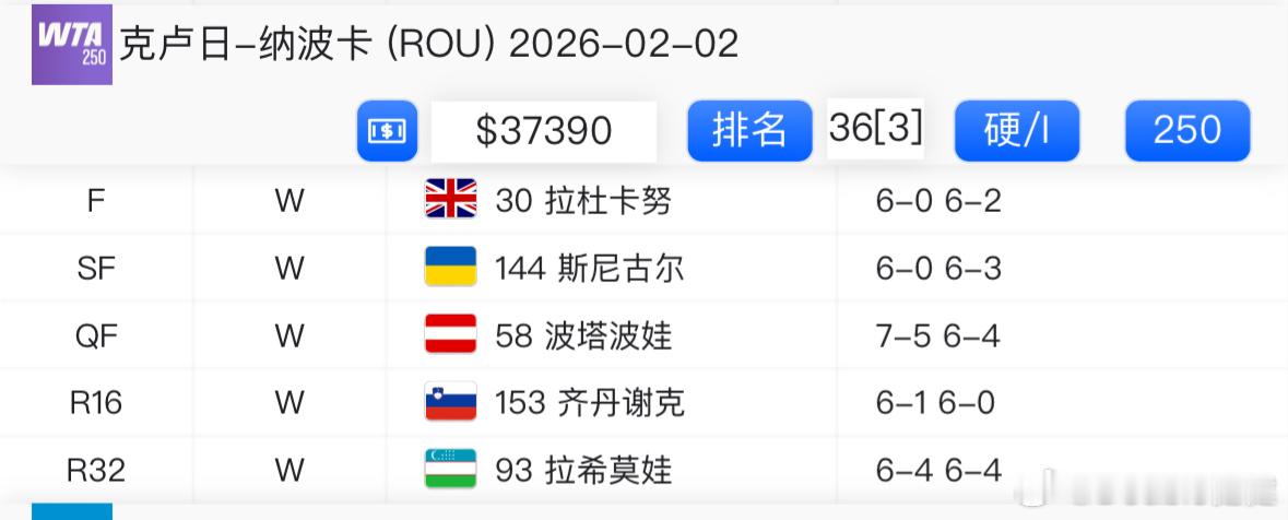 35岁老将科斯蒂亚计划今年退役,她在🇷🇴克卢日-纳波卡赛决赛6-0/6-2横扫拉杜卡努,本站未丢一盘送出三个蛋,夺得生涯第4冠(2008塔什干、2021伊斯坦布尔、2025克利夫兰),即时排名超过王欣瑜,来到No.31。拉杜卡努无缘生涯第二冠(2021美网)。这很澳网