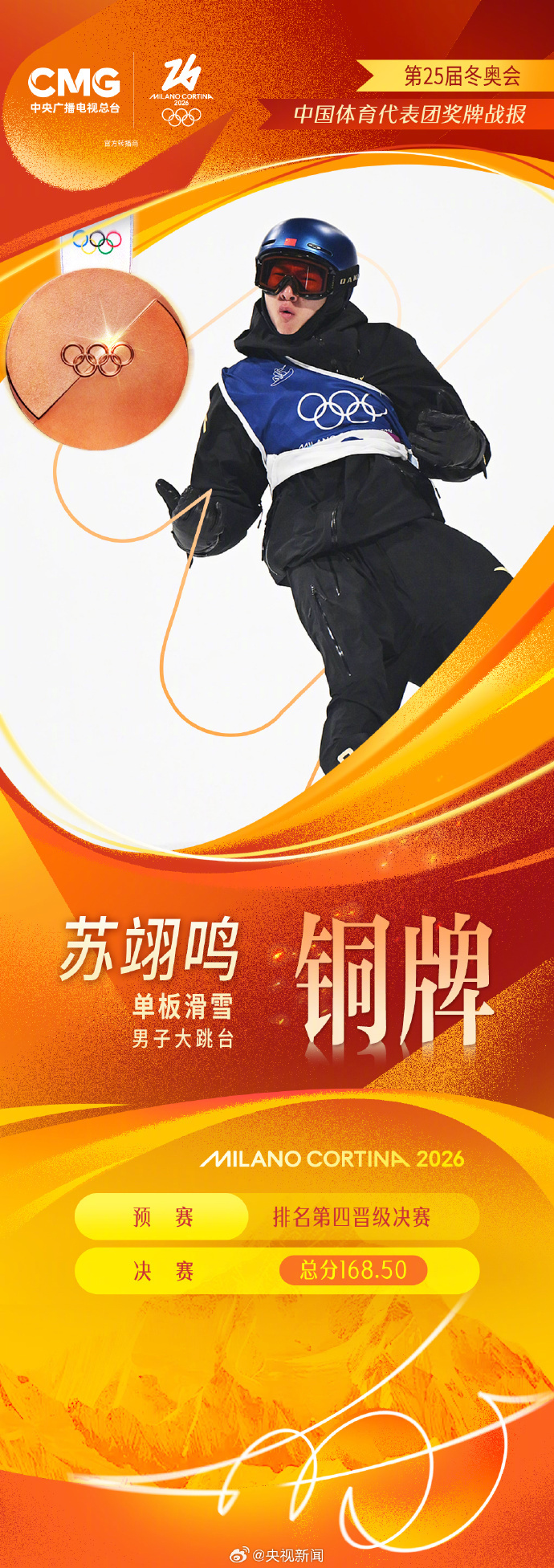 第三轮,苏翊鸣顶住压力,拿到80.25分,总分168.50分获得铜牌。日本选手木村葵来以179.50分获得金牌、木俣椋真171.50分获得银牌。#中国队米兰首枚奖牌##苏翊鸣说身披五星红旗最骄傲##苏翊鸣教科书般的1980##苏翊鸣太帅了##苏翊鸣第一跳1980# #苏翊鸣第二跳73.75分##苏翊鸣第三跳80.25分##苏翊鸣 触雪# #苏翊鸣大跳台铜牌#(央视新闻)