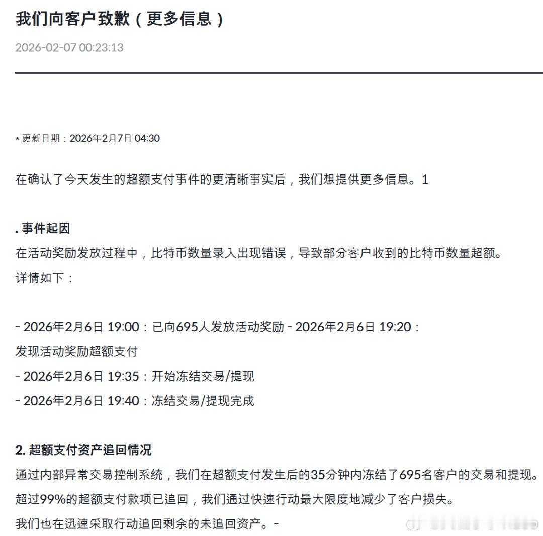 他在周六的声明中称:“我们对由此造成的混乱与不便表示最深切的歉意。我们深感责任重大,承认未能守住虚拟资产交易所的两大核心价值——稳定与诚信。”