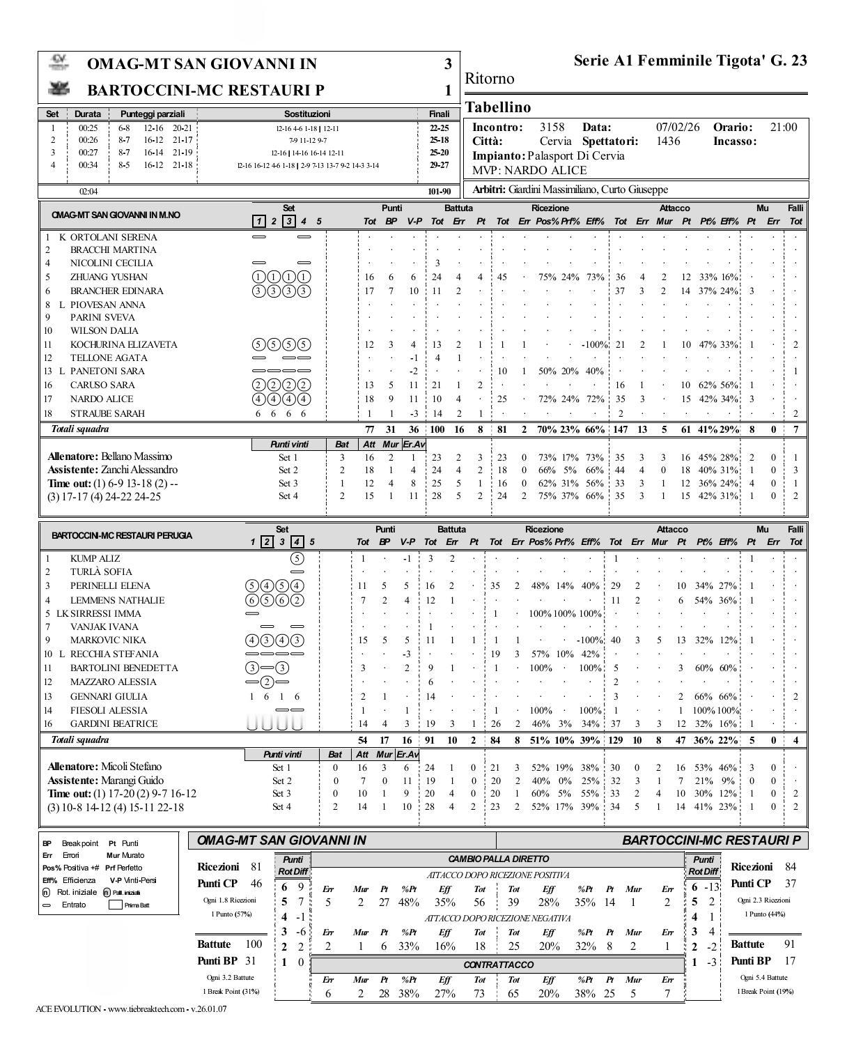 庄宇珊稳定发挥,圣乔瓦尼再下一城 2025-2026女排意甲常规赛第二十三轮,圣乔瓦尼主场在先失一局的情况下3-1逆转佩鲁贾完成本赛季双杀,比分22-25, 25-18, 25-20, 29-27。此役过后,圣乔瓦尼保级形势一片光明。已成全队稳定器和压舱石的庄宇珊,继续高光表现,全场贡献了12记扣球得分、4个直发得分,接了45个一传,比全队一半还多,无一失误,其高质量一传为全队进攻提供了更多选择,本场比赛全队攻手得分全部上双。纳尔多18分全场得分王并MVP。 圣乔瓦尼: 纳尔多35扣15中3失0被拦、3拦0发18分 布兰彻37扣14中3失2被拦、3拦0发17分 庄宇珊36扣12中4失2被拦、0拦4发16分 卡鲁索16扣10中1失0被拦、1拦2发13分 科丘里那21扣10中2失1被拦、1拦1发12分 斯特劳贝2扣0中0失0被拦、0拦1发1分 佩鲁贾: 马尔科维奇40扣13中3失5被拦、1拦1发15分 加尔迪尼37扣12中3失3被拦、1拦1发14分 佩里内利29扣10中2失0被拦、1拦0发11分 莱门斯11扣6中2失0被拦、1拦0发7分 巴托利尼5扣3中0失0被拦、0拦0发3分 真纳里3扣2中0失0被拦、0拦0发2分 菲耶索利1扣1中0失0被拦、0拦0发1分 库姆普1扣0中0失0被拦、1拦0发1分 马扎罗2扣0中0失0被拦、0拦0发0分 圣乔瓦尼-佩鲁贾: 进攻得分:61-47 拦网得分:8-5 发球得分:8-2 对方送分:24-36 总得分:101-90 一传到位率:70%-51% 一传完美率:23%-10% 圣乔瓦尼女排