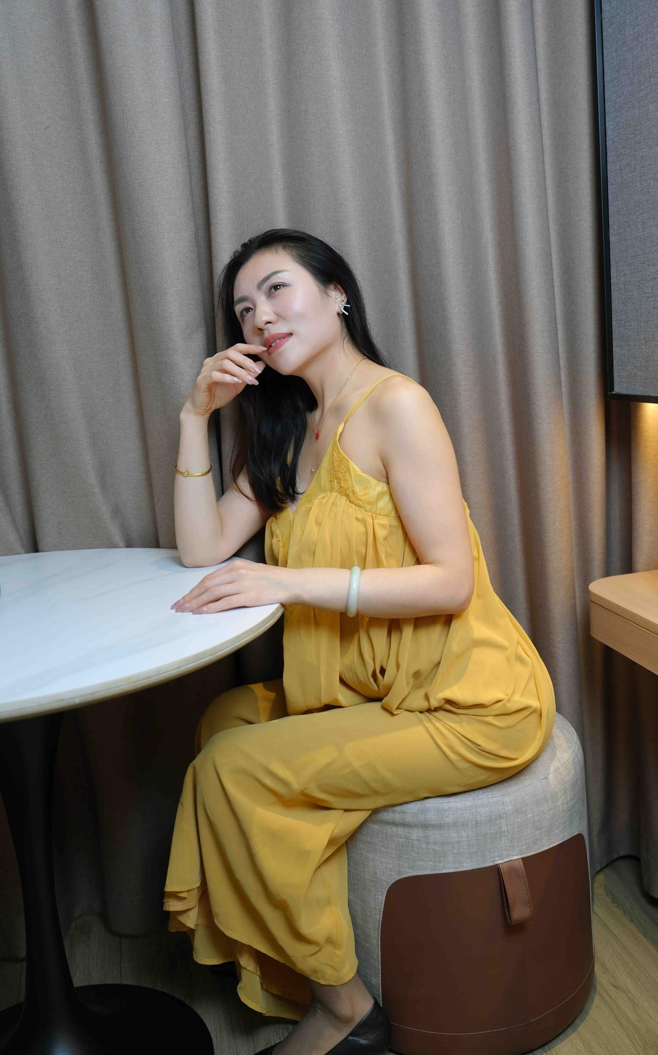 优雅气质,浅笑嫣然,黄色连衣裙与米色背景相得益彰。