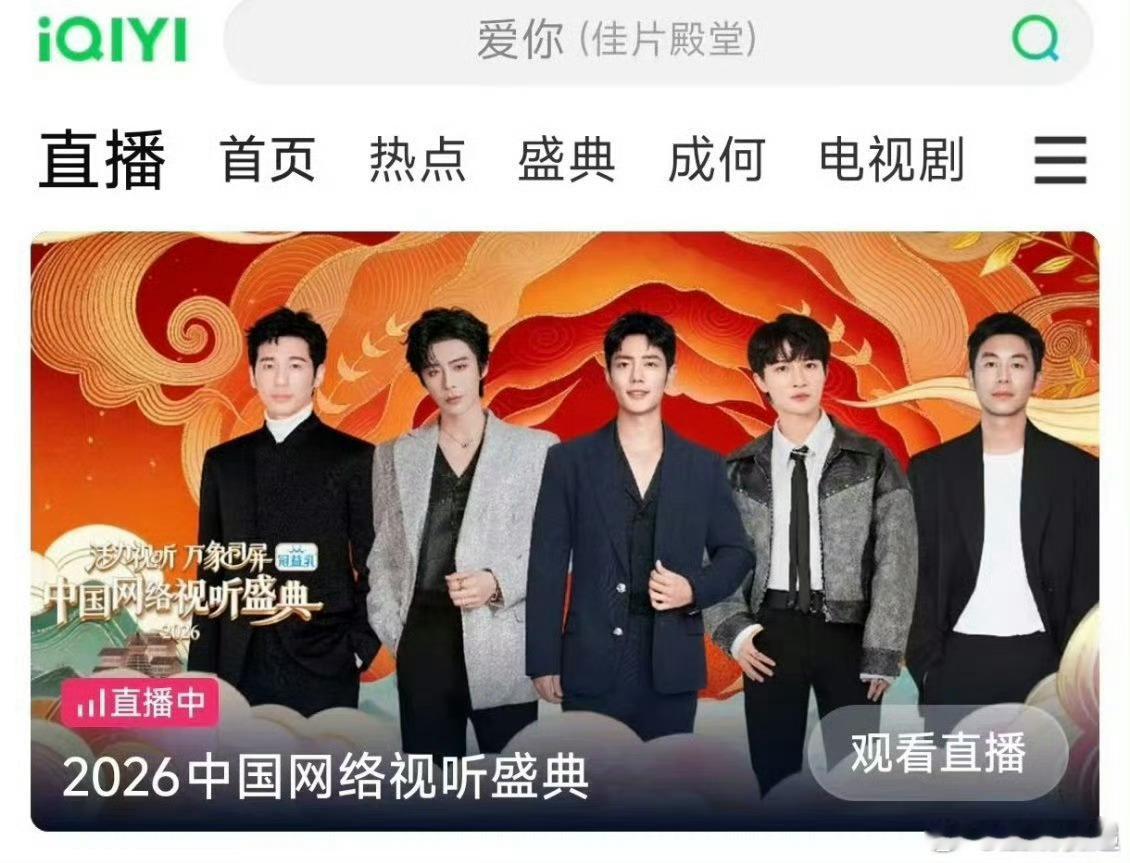 肖战三大平台网络视听封面2026网络视听盛典,肖战同时登上鹅、桃、酷三大平台直播封面。虽然是以不同的群像组合形式呈现(爱奇艺+刘宇宁周深/腾讯+单依纯/优酷+龚俊佘诗曼),但无论和谁同框,肖战都是绝对的核心视觉中心。