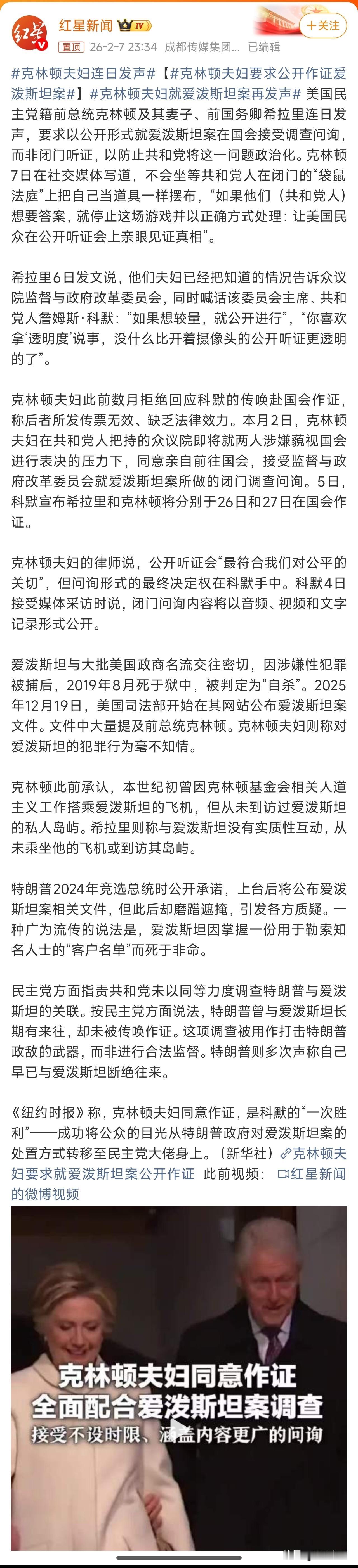 克林顿夫妇要求公开作证爱泼斯坦案,克林顿夫妇放了一个大招,要公开全公开,要死一起死,不能只把矛盾对准我克林顿。 这是一种鱼死网破地较量,反正大家都和爱泼斯坦关系密切,甚至特朗普比所有人都与爱泼斯坦关系密切,那么,我克林顿就公开作证,好好向全美国人民讲一讲,甚至让全世界人民都看一看美国的这一摊子破事。 这就是逼着共和党为了自保,也要对克林顿夫妇留出一条活路,要不说,大家都把事情烂在肚子里。这是把皮球踢给了共和党,踢给了特朗普!