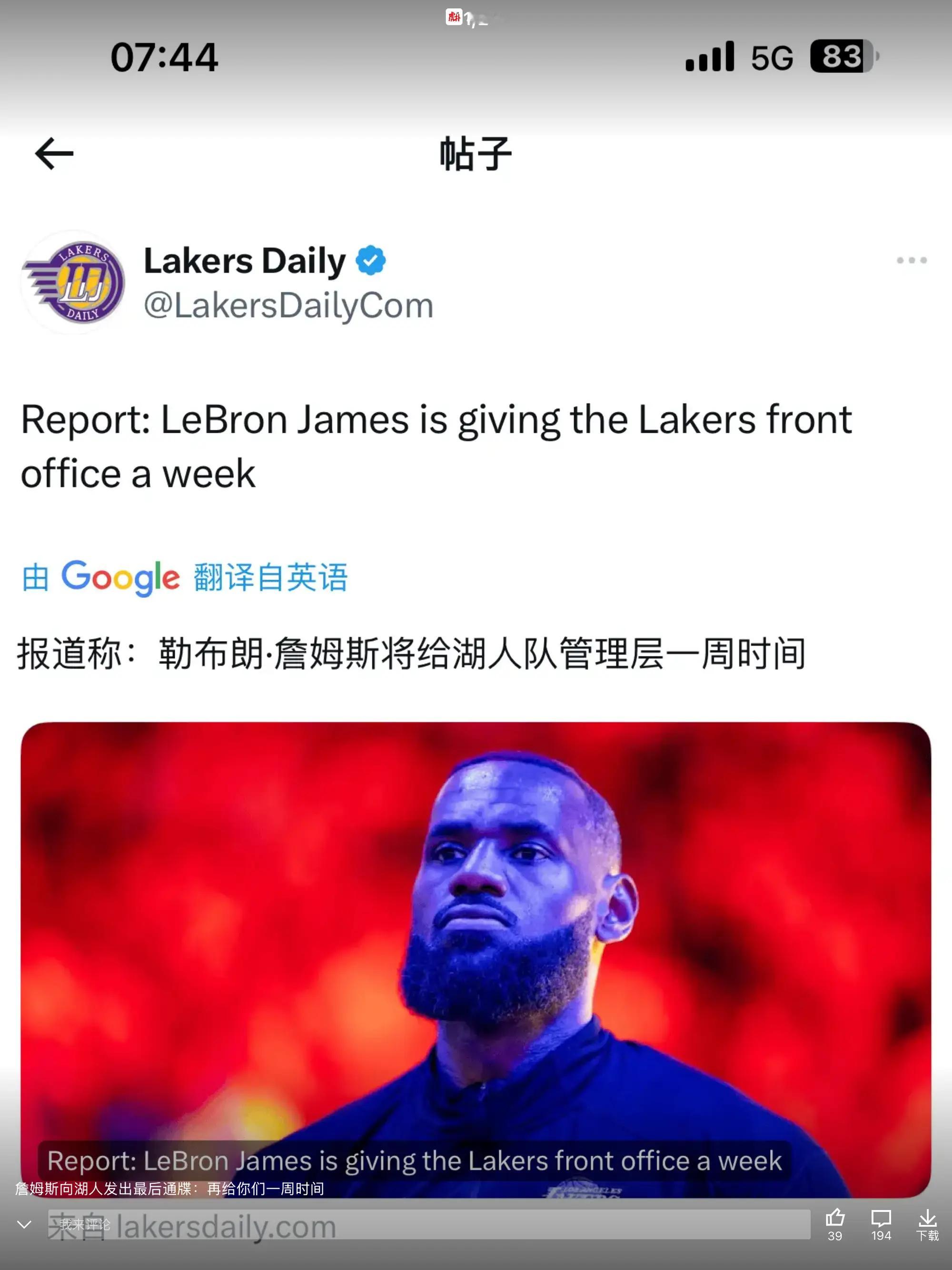 Lakers Daily:詹姆斯会宽限湖管一周的时间考虑续约的事项。